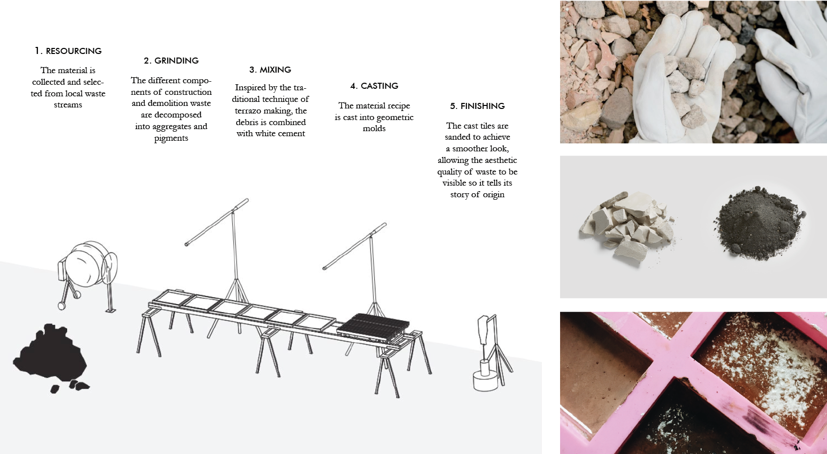 Materials were collected from local sources such as debris bags in streets, local manufacturers, or building sites. The upcycling process consisted of processing the secondary materials through different steps: grinding them in different granulometries, mixing them with a binder, casting them into molds, and finishing them through sanding and the application of non-toxic coatings.