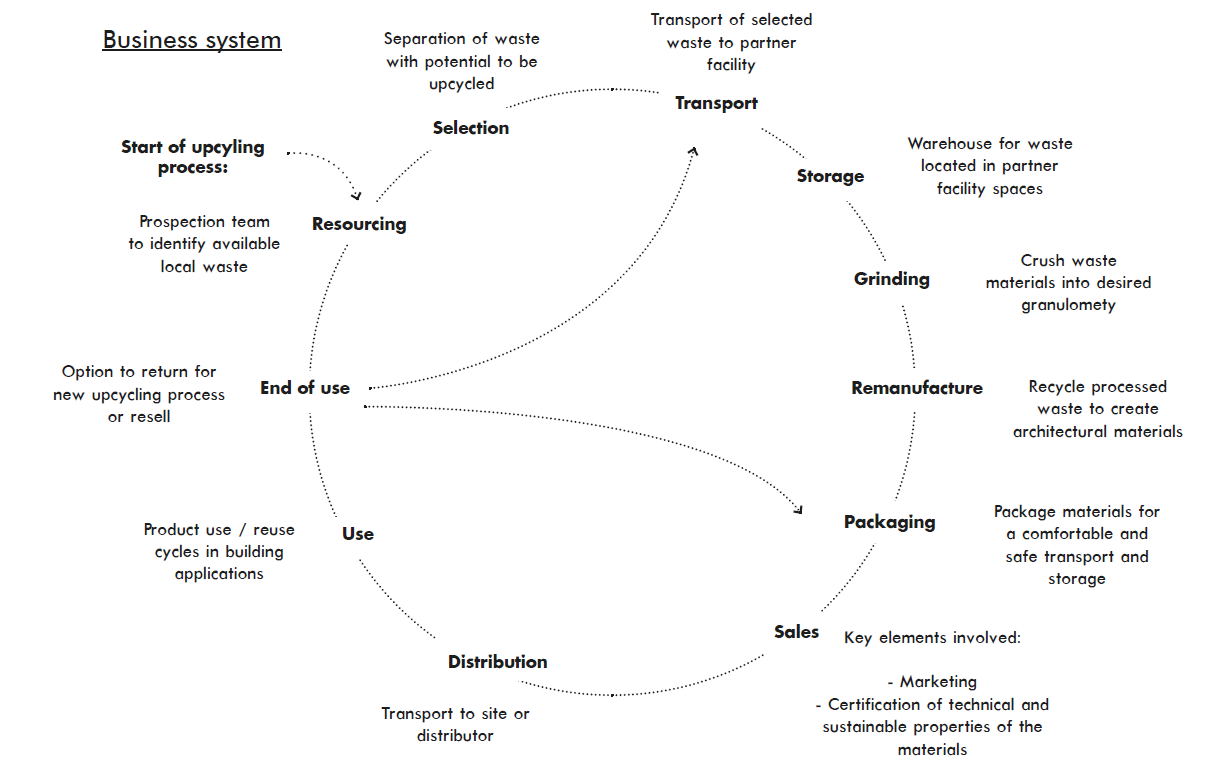 For upcycling, the manufacturing process was simplified to few basic steps, to avoid an unnecessary demand for energy and water, therefore reducing its environmental impact, reinforced by the fact of recovering materials from the cities own waste flow at a short distance. The calculated carbon saving potentials at product level suggest that secondary-based products emit carbon equivalent to 30–50% of the new, primary production alternatives. The waste produced in the process during stages of grinding, mixing, and sanding can also be reused to make new materials of the same kind, so the byproducts can be fully utilized.