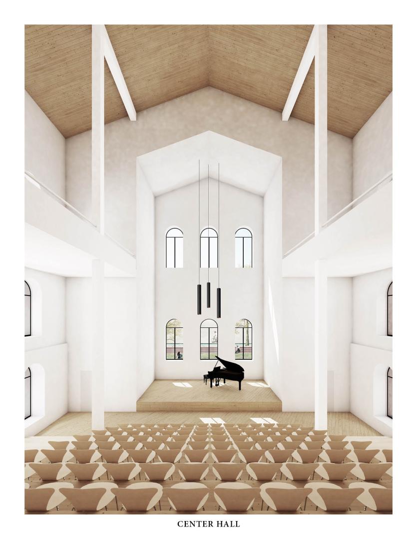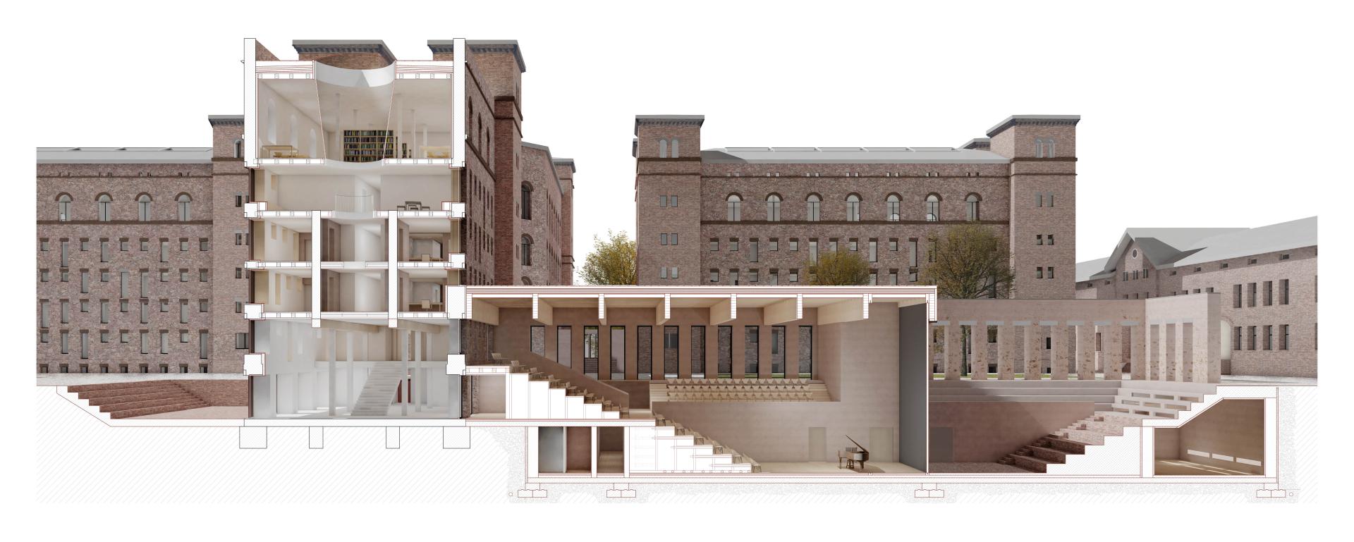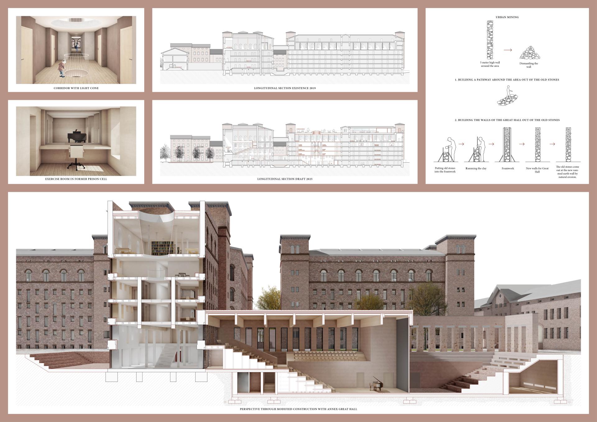 The new great hall of the music academy will be connected directly to the existing building. Thus it is possible to walk through the former prison. A new building is created that is constructed from old materials reclaimed directly on site. The formerly separating structures appear in new, connecting elements and link the city with the existing building. The architecture is resocialized.
