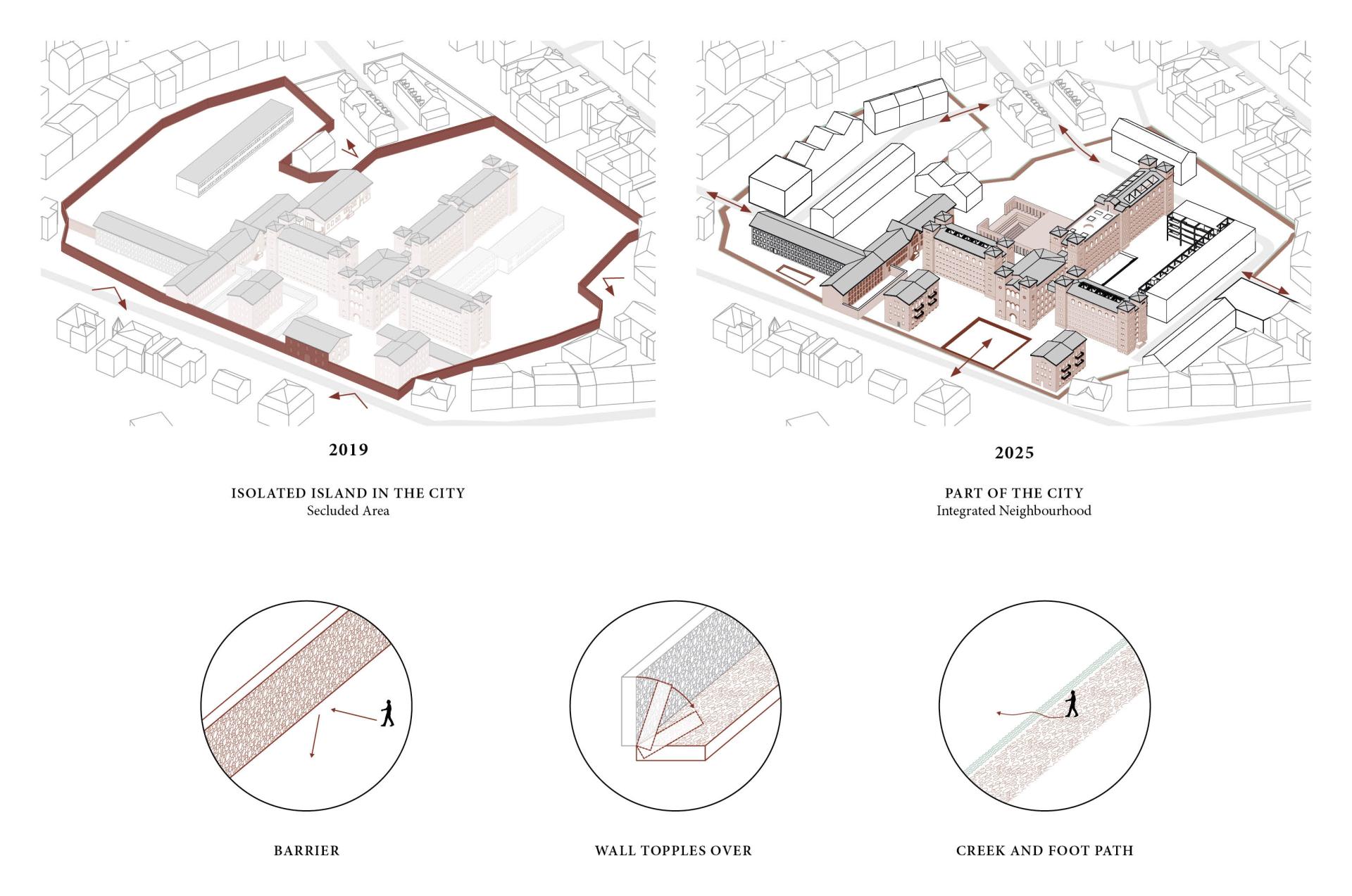 In order to make the area accessible, the demolition of the 5 meter high prison wall is unavoidable. The wall is thus tilted and forms a footpath around the area. In some places the course of the wall is blurred by overbuilding. In others, it is set off by a stream with an adjacent footpath. This creates integration into the urban environment.