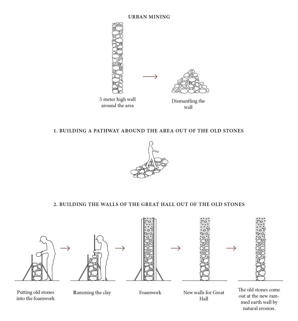 The materials of the deconstructed buildings will be reused directly on site. For example, the quarry stone porphyry from the demolished wall will be reused in the exterior walls of the new great hall of the Academy of Music. Clay rammed walls with a large proportion of the quarry stone will be formed. In the process, the outermost layer of the clay is removed by weathering so that the stone reappears.