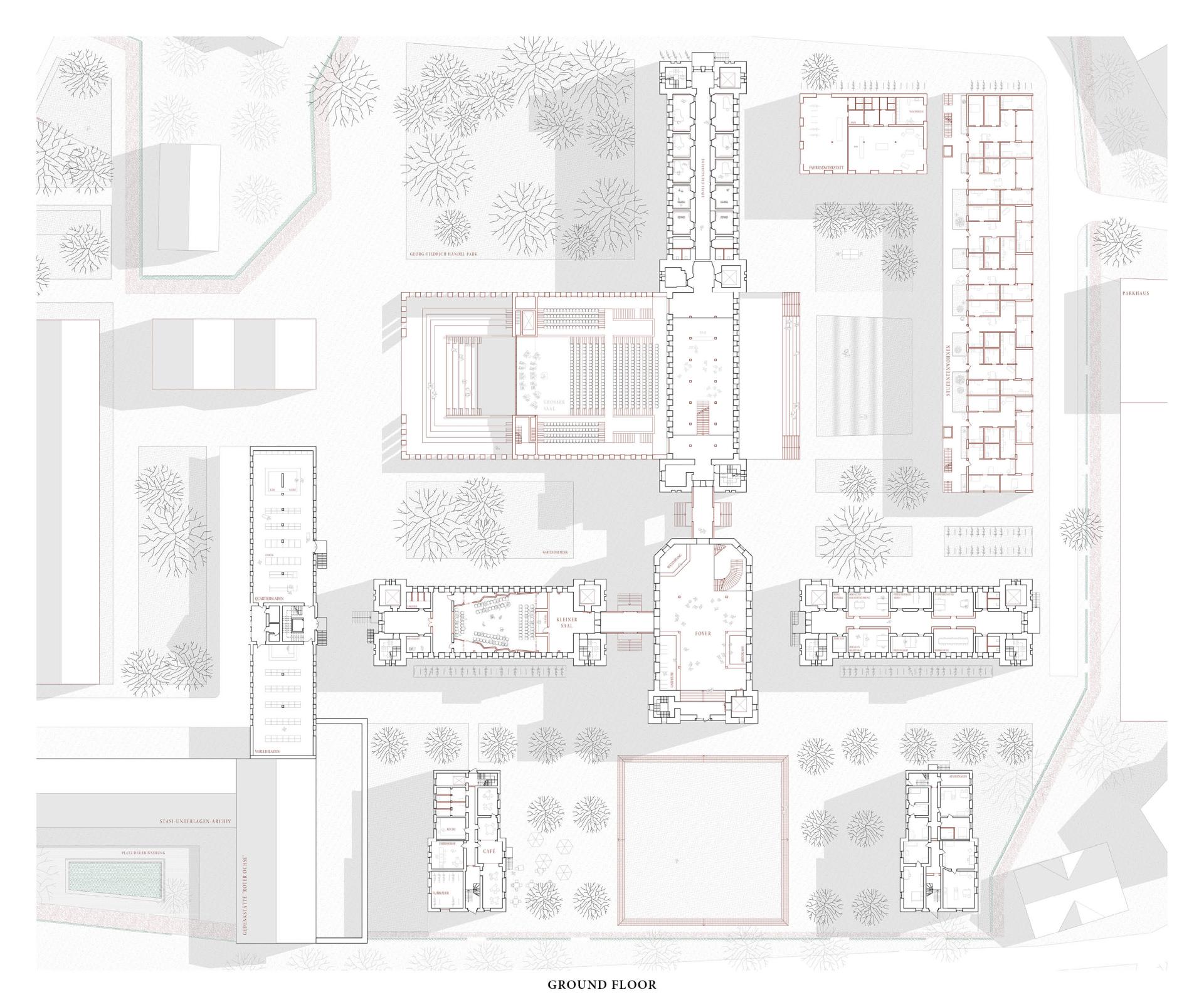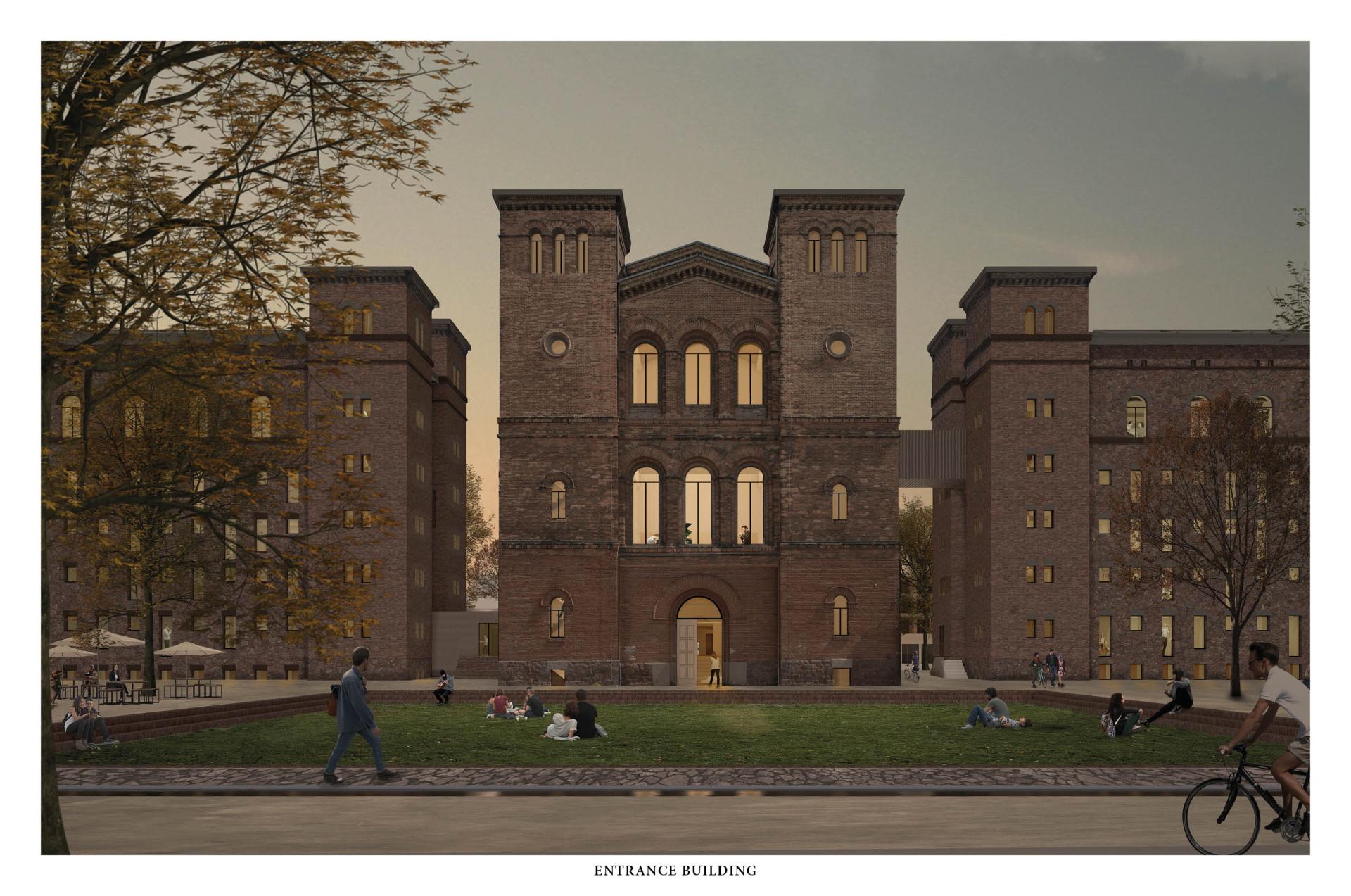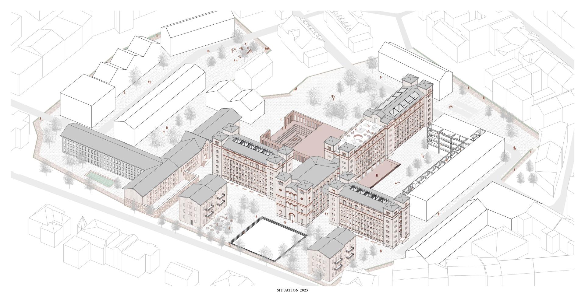 In order to make the area accessible to the public, new roads and paths will have to be built across the site, with pedestrian and bicycle paths crossing the area from east to west. The site plan clearly shows how the symmetry of the existing buildings will be interrupted and how the redeveloped area will be integrated into the city.The former prison buildings will be revitalized and expanded. Some new housing buildings will be added to the site as inner-city densification. The path around the site links the outdoor areas and two parking garages take over the stationary traffic.
