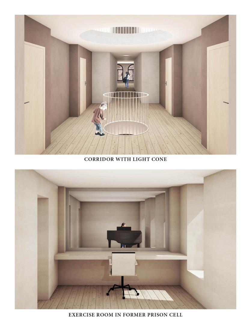 With the aim of uniting the image of the prison interior, which exists only in fantasy, with that of reality, the site must be made accessible to the public and given a public use. Only in this way can a large public experience the place and make it their own. A music academy should find its place on the former prison grounds: Students practice here daily and enliven the area. The use as a music academy offers further advantages: A large part of the cells can be preserved to create many small practice rooms for the music students. In addition, to break the island character of the former prison, a mixed use of the site is needed: Residential, public uses, and commercial should coexist.