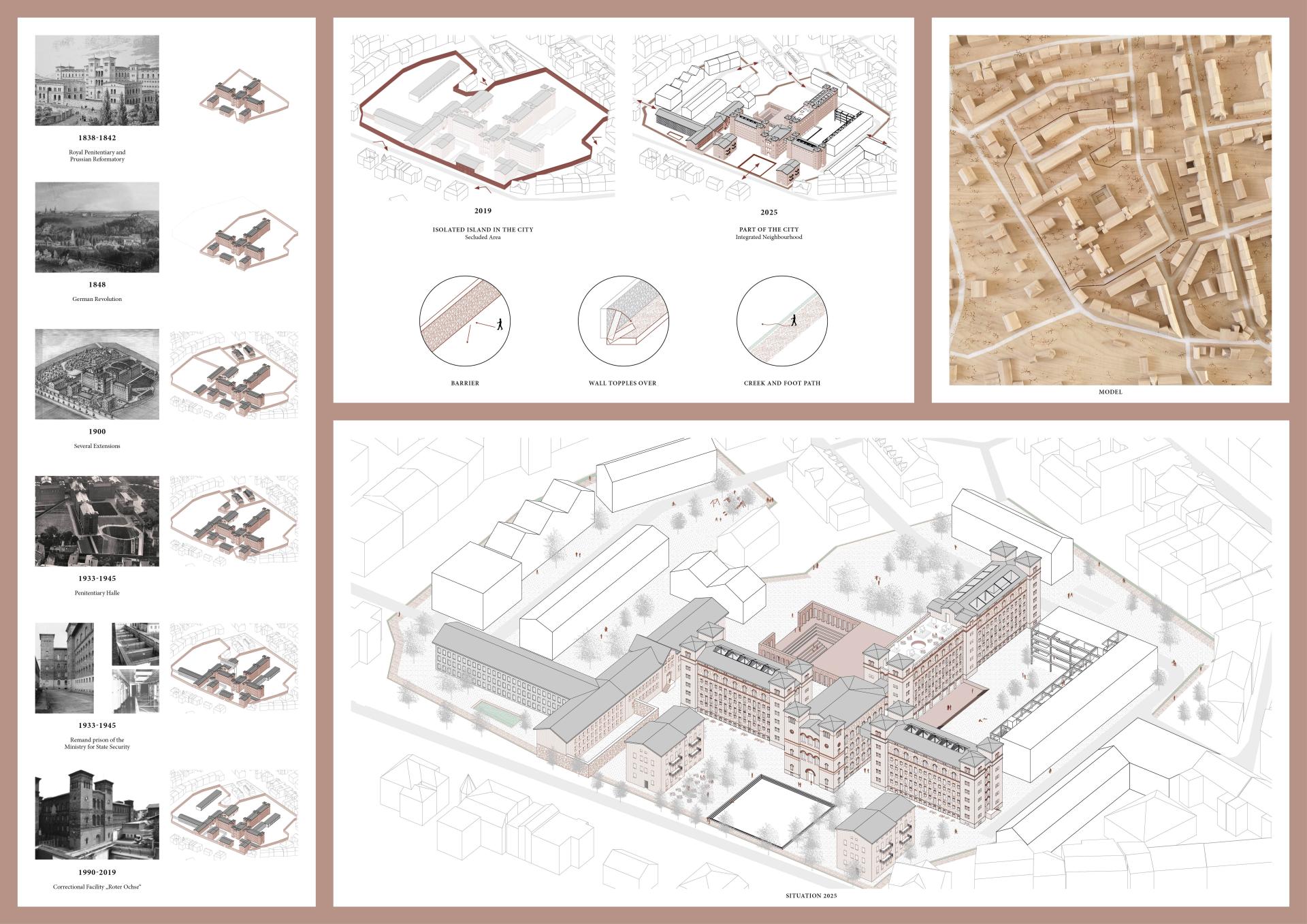 The work develops a strategy for the sustainable conversion of the prison Roter Ochse in Halle an der Saale, which will be vacant from 2025 when the EU imposes a minimum size of prison cells. The Roter Ochse is an ensemble of buildings steeped in history. E.g. one part of the building was used as an execution site during National Socialism. The architecture of the Rote Ochsen must thus be resocialized after its use as a prison has ended. It is planned to be converted into a music conservatory.