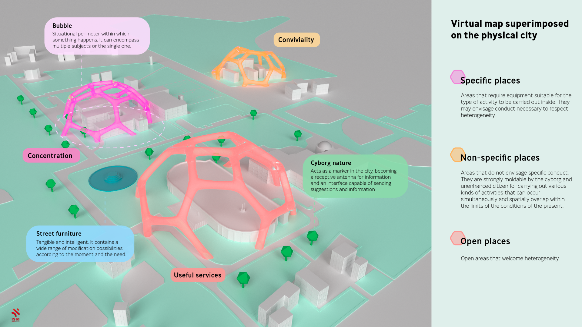 The citizen, emancipated from the need for work, experiences the city as a continuous laboratory of active citizenship, plans its activities and adheres to the continuous proposals that are born and evolve. Through the development of intelligent Cyborg and Device technologies, the spaces of the city are rethought through three levels: the physical, the real / virtual and the virtual. The city assumes adaptive behaviors, the citizen is able to move fluidly between: a self-referential vision, in which the personalization of the aesthetic and functional aspects, acts according to individual parameters and is precluded to others; a heterogeneous vision visible to all, in which spatial modification is the synthesis of collective choices and needs; a homogeneous vision, physical or digital, accessible to groups of citizens united by common intentions or by similar levels of cyborg modification of bodies. By respecting the different individual choices for modifying the body's potential, the cyborg city allows each citizen to actively act on places, through an intelligent urban furniture that is made up of elements such as thresholds (borders of introduction to situational areas), heterotopic filters (urban lenses that allow the unmodified eye to physically visualize the virtual plane juxtaposed to the city), cyborg plants capable of operating as natural interfaces...