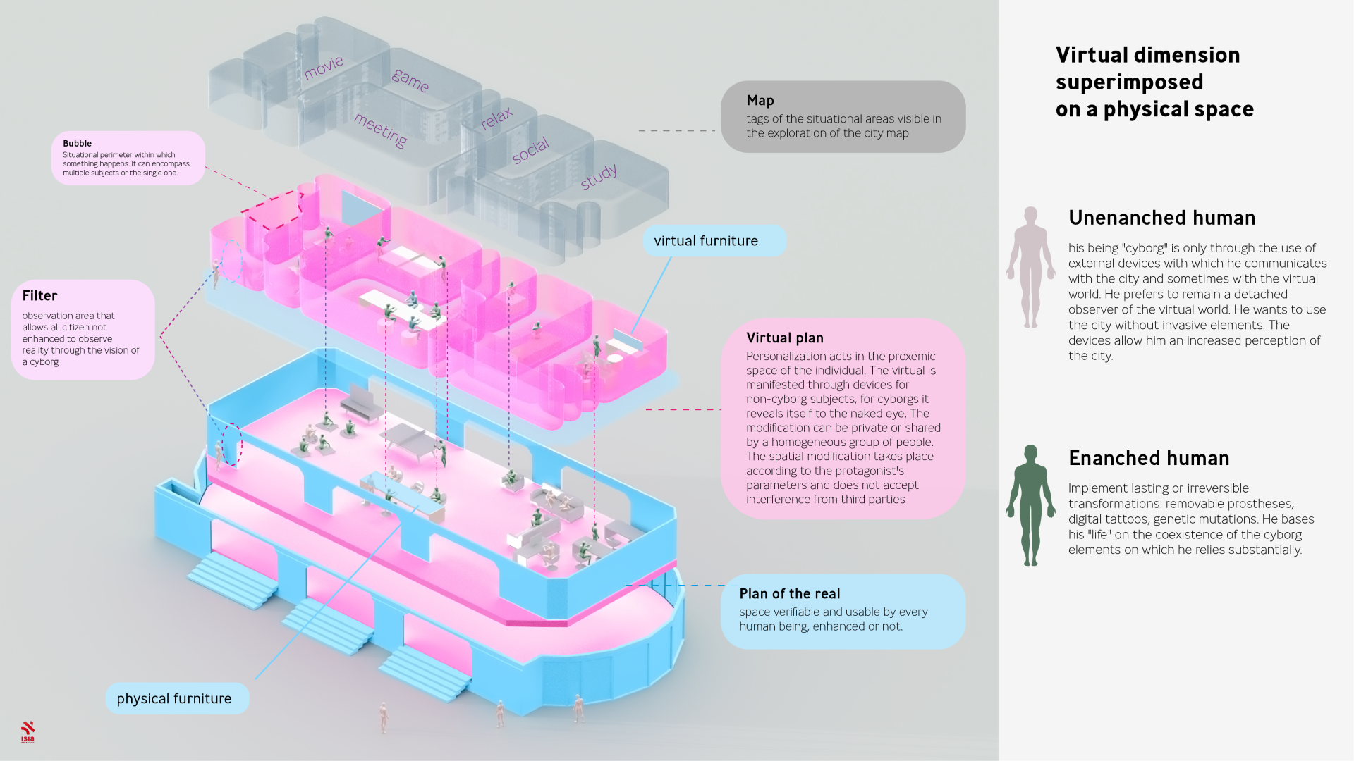 The cyobrg city is a systems design project that designs the future relational dynamics between the citizens of the future and the places they inhabit. Urban spaces are rethought to be modified as fluid places: the cyborg and non-enhanced human being will be able to define the temporary functions of an area on three layers (the real, the real-virtual, the virtual). The Cyborg city does not impose a preconstructed model to adapt to, but is based on a bottom-up process.