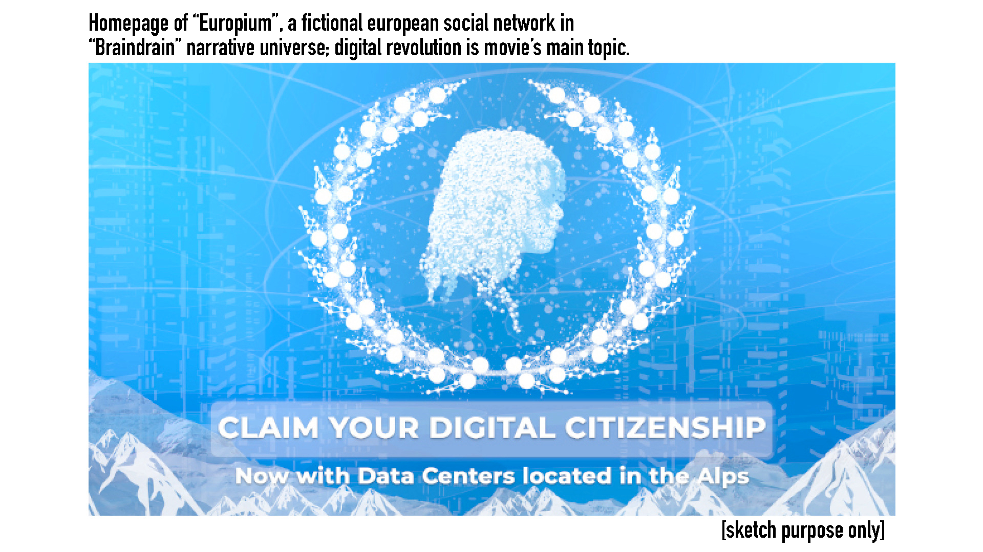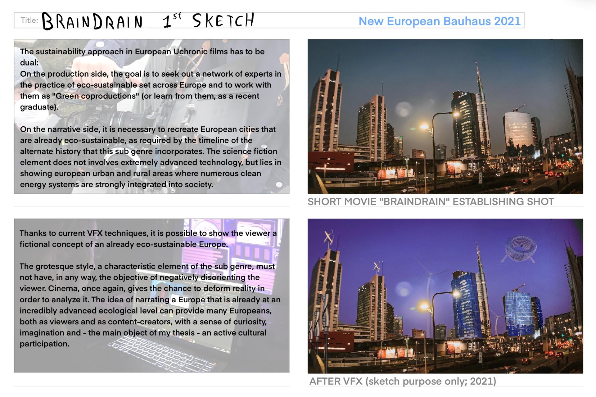 "European Uchronia" (or "Eurochronia") is a sci-fi and contemporary uchronia "cross genre" concept. Conceived as dissertation at Fine Arts Academy, this film subgenre represents narratives set in a Europe with an alternative historical course, where the ecological transition has already been completed, but dangers of the digital revolution are just on the corner. My Short movie "Braindrain", a practice transposition of theory, deals with digital ethics topic following Cambridge Analytica scandal