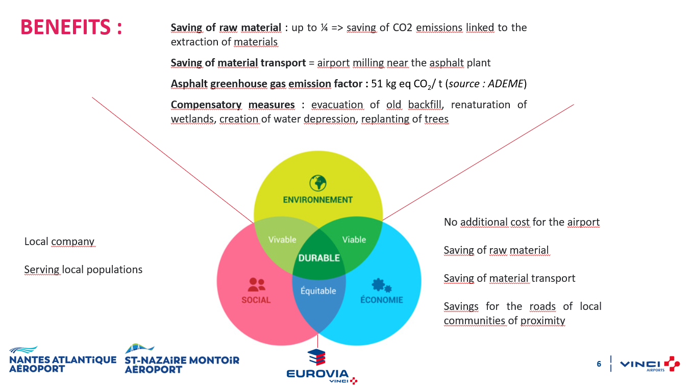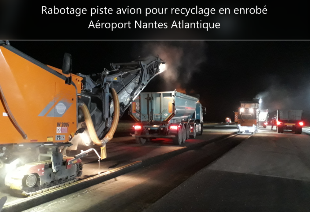 Reuse of airport runway milled material in asphalt mix formulations for the rehabilitation of the runway/airplane stand and the department's roads and highways, which reduces both the use of raw materials for asphalt mix and the amount of waste to be treated. Since the Grenelle de l'Environnement, road manufacturers have committed to reintroducing a percentage of the freshly made asphalt from the construction sites into their formulations.