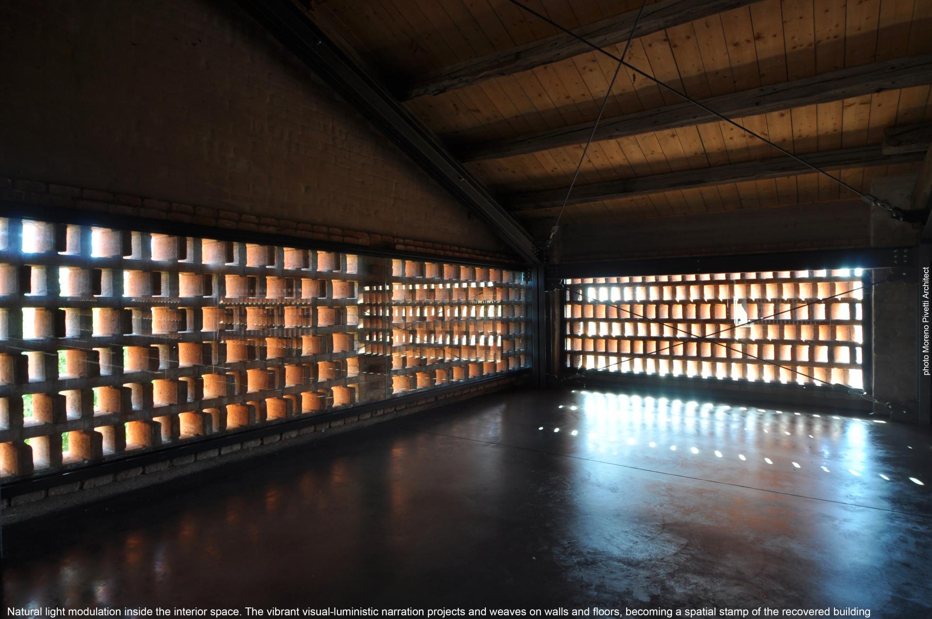 The intervention concerns the emptying of an ancient former factory from its internal structures, now compromised by a violent double earthquake in 2012, and the insertion inside it of a new frame able to rehabilitate the building for a new functional flexibility. The restoration involved the surgical preservation of the envelope, compensated in the gaps and lesions with “a few calibrated blows of a scalpel”, the one necessary to restore its unitary image and the historical-testimonial identity. Inside, however, the wall box is freed from inconsistencies and compromised structures and, therefore, remodeòed by an interposed metal frame that follows the original static scheme. The incorporation of the new structure translates a dual purpose. On the one hand, the preservation of the wall envelope is required with the restoration of the original structures damaged by the earthquake. On the other hand, while respecting its identity characteristics, the building includes a ‘slender’ structure, indipendent of the envelope but anchored to it, flexible and reversible for use. The solution adopted resolves the contrast with the insertion of a neutral colored metal frame (color of the shadow), indipendent from the wall box, to support the intermediate deck. The mechanical insert inside the historical artifact is an ideological declaration of one’s otherness. An attempt is made to recover the integral dimension of the space from the old barn and therefore the possibility of perceiving the invaded space in a unitary way. The warm grain of the wall texture has been rediscovered accentuating the expressive message of the wall undulation. The special installations refuse to show themselves in order to harmonize silently with the architecture. The LED strip lights integrated into the metal structures are the neutral comment to the lively textures of the walls: the grazing light helps to expose the history of the building, reviving it as a “museum of itself”.