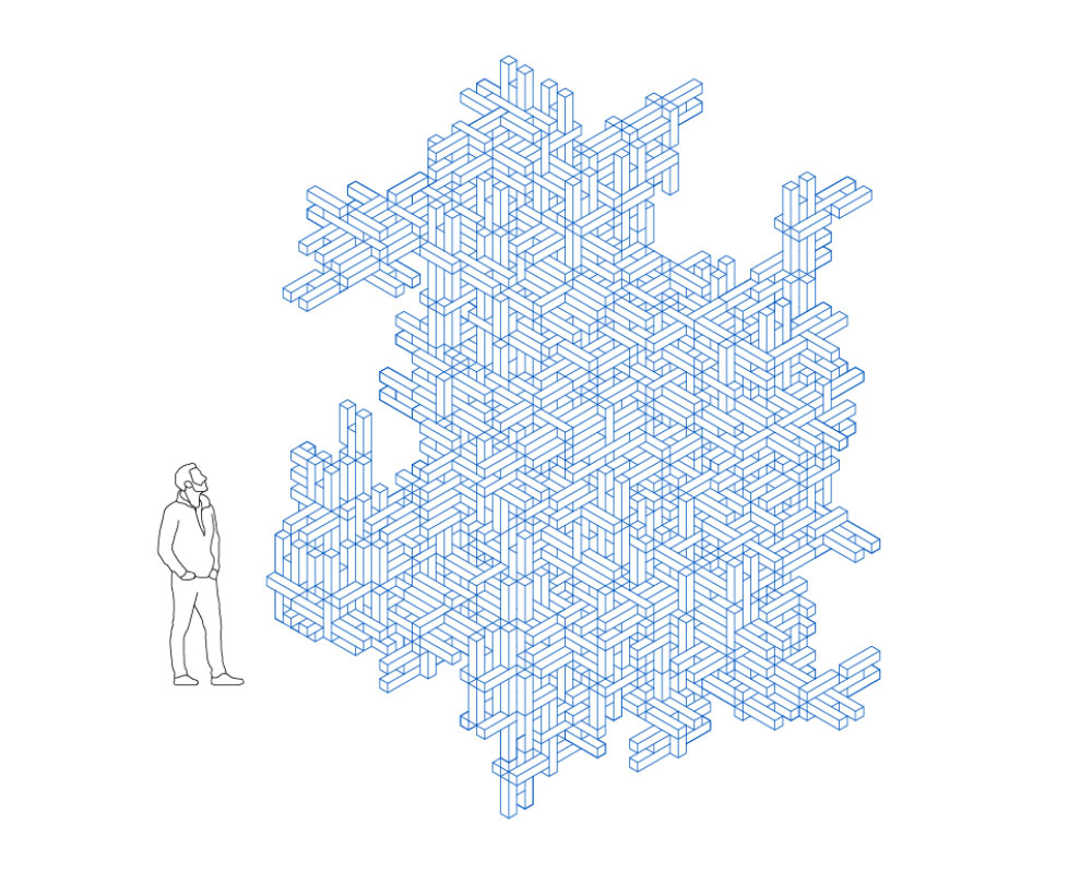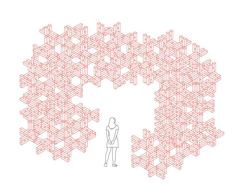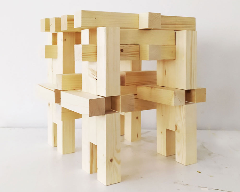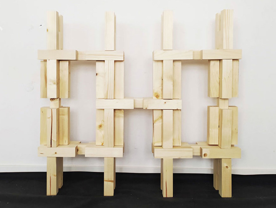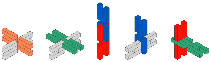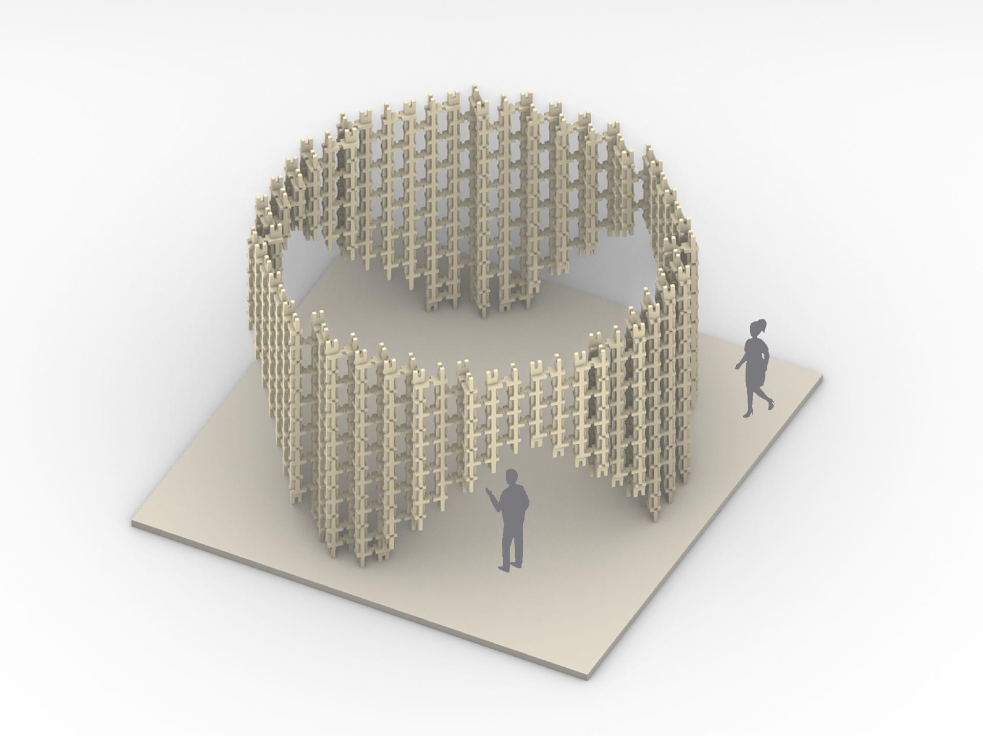 Departing from the technique of weaving, a single building element was developed constructed of 5 small timber pieces, offering a multitude of interlocking connections between two or more elements. The pieces do not require any external connecting components. This accounts for shorter assembly times on-site, because the installation of individual connectors is omitted. Hence, the tool-free assembly fosters participation as being more accessible to non-skilled participants. The simplicity of the element aims to unlock creativity and allow an easy buildup of small furniture as well as larger and more complex structures of architectural scale.