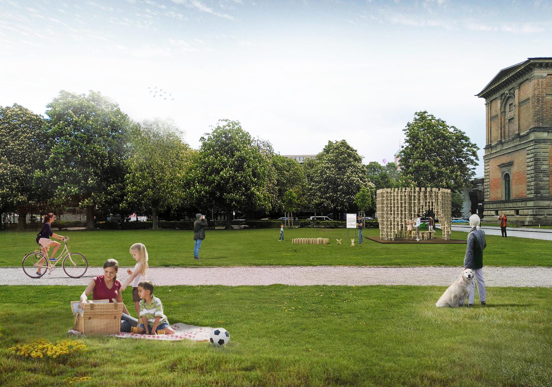 The designed pavilion structure is brought to life through the collaboration of the participants and continuously develops its shape over the course of a week until reaching the final configuration. Apart from the assembly of the pavilion structure, the pieces around the building site are open to being used spontaneously for exploring new arrangements and creating small furniture.