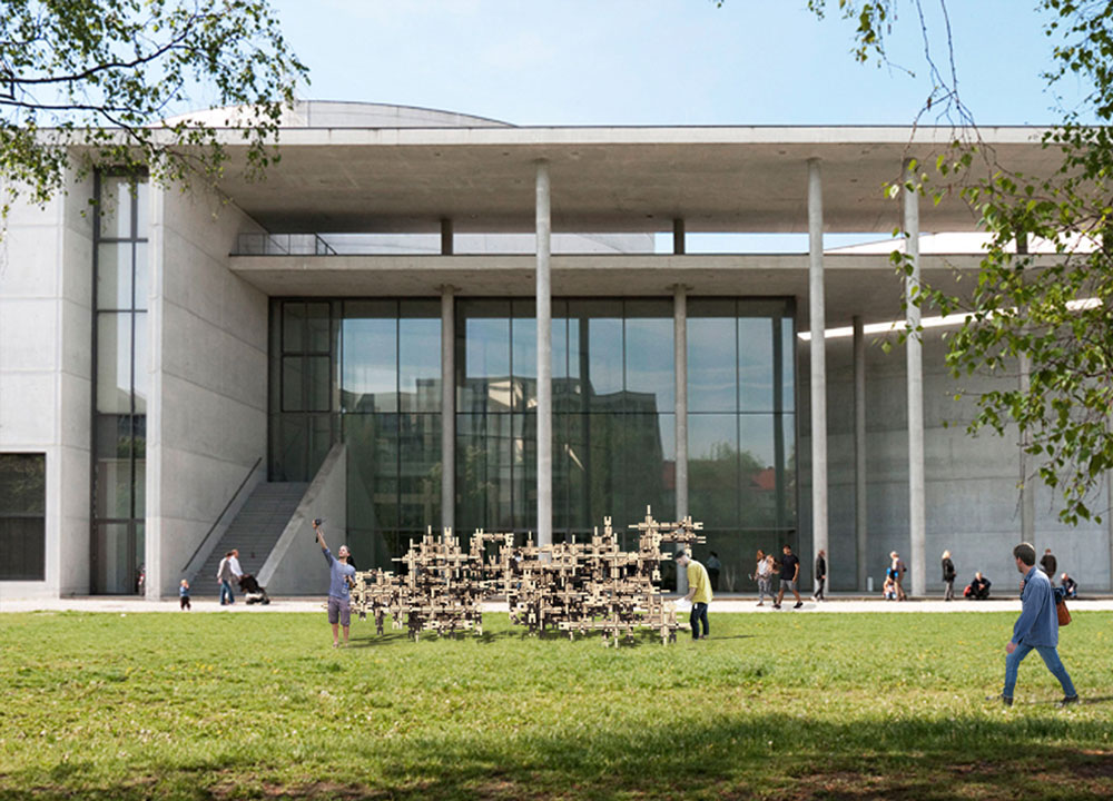 Being part of the Kunstareal festival 2021 in Munich, Collective Assembly aims to present an inclusive approach to construction, architecture and art. The single element with its small size and weight was designed to be handled by adults as well as children, and its operation requires no prior building knowledge. Therefore, the simplicity of the assembly process supported by the use of AR visualization creates an inviting, playful and interactive happening in a public space.