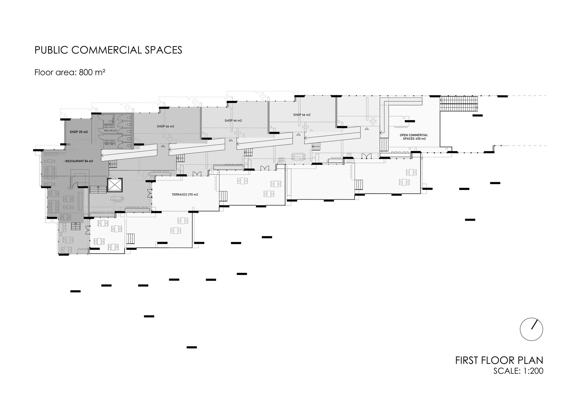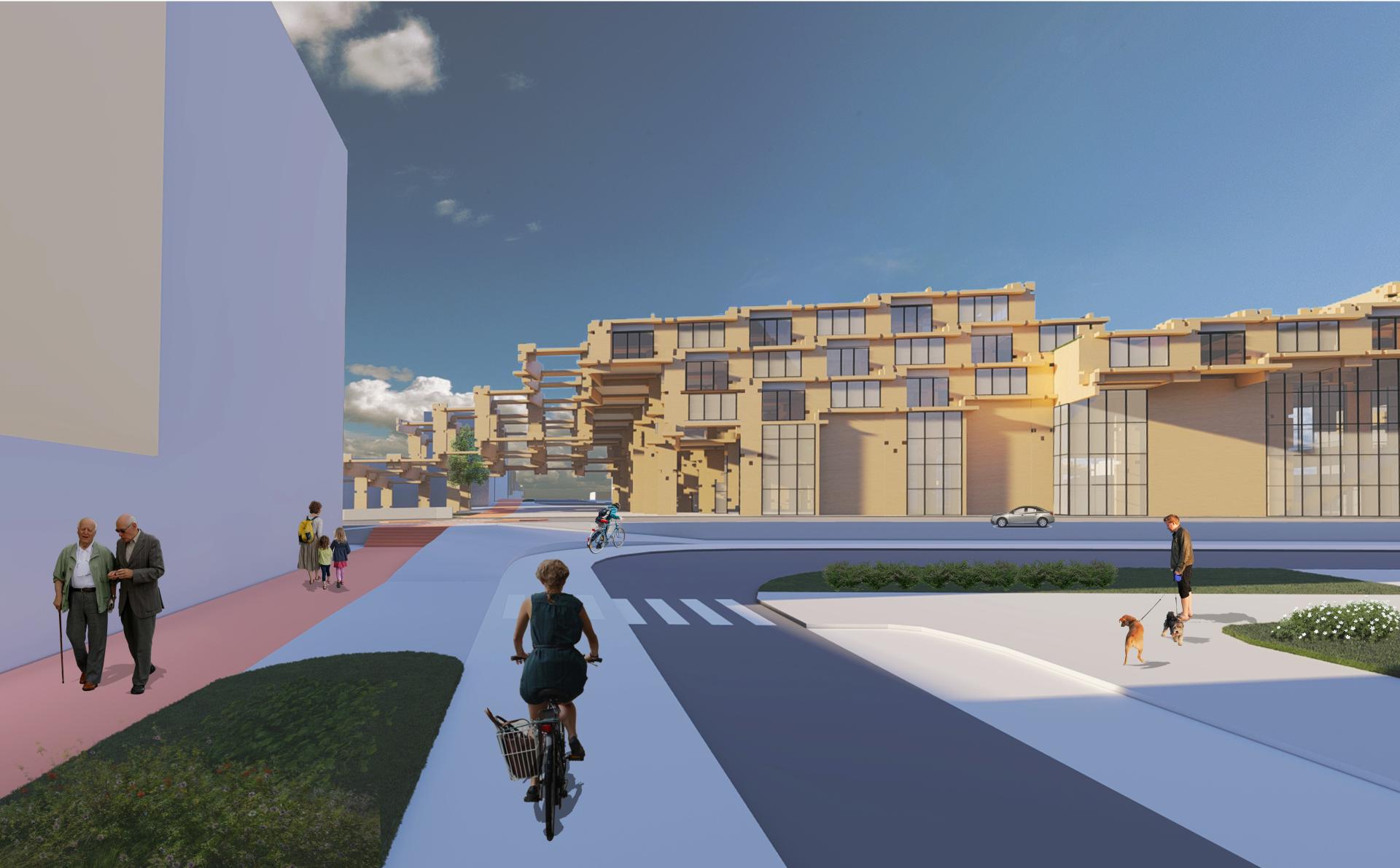 Key objectives of our concept in terms of inclusion emerge in the resolving of level difference, which appeared due to our modular system. To make the building accessible for everyone we adjusted modular parts to fit in the idea of accessibility with ramp systems on the second floor of our public space area. The ramp smoothes out the inequality of the levels of the second floor, giving access to all shops and cafeterias through the ramp. As inclusion is an important part of our concept, we modified our module to fit in the needed level of accessibility. Also, the public space is designed to be accessible for all ages and mobility types. The park is designed to combine different types of atmospheres from the rushing hour quick track to a peaceful wooden trail in the natural area. All height differences are solved through ramp connections and pedestrian area is maximized to create a pleasant and safe environment for everyone.