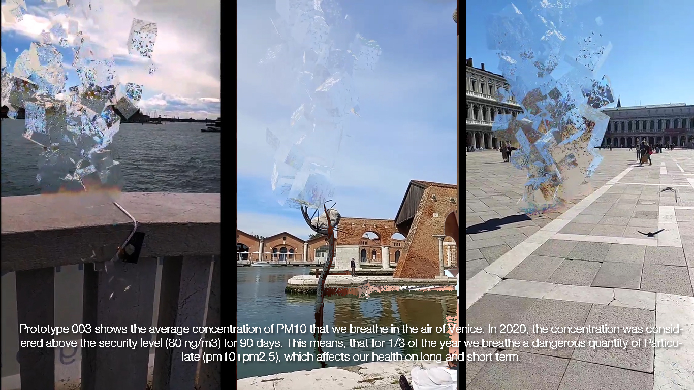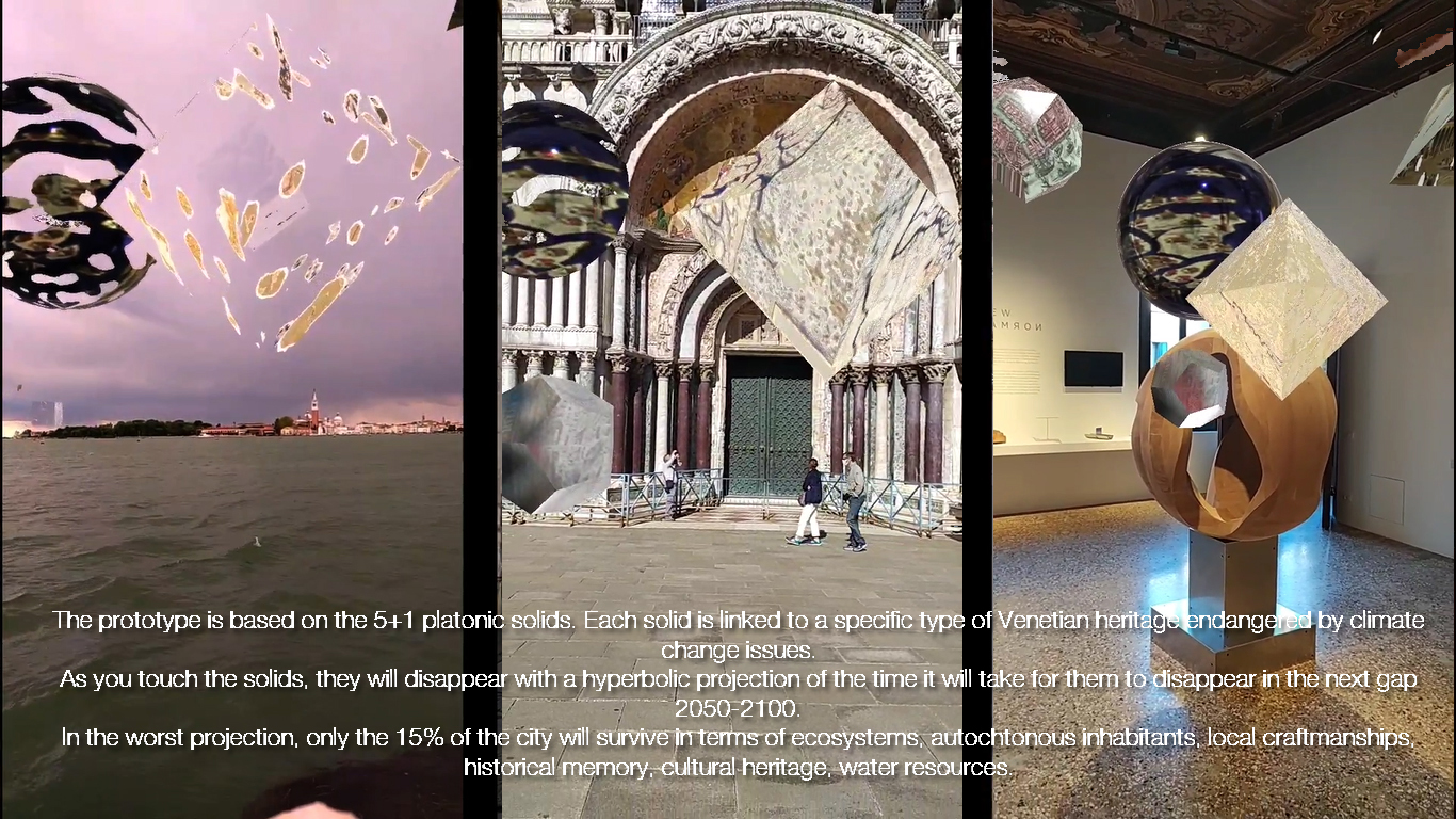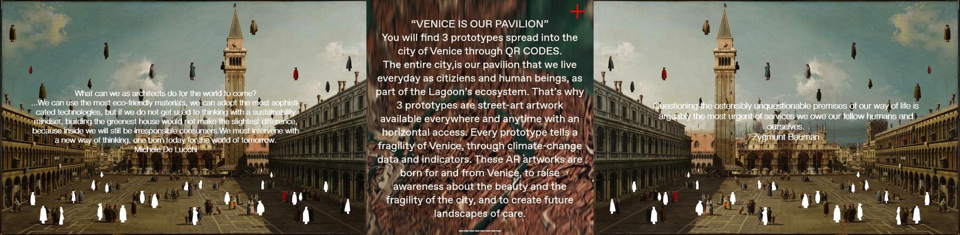 The entire city,is our pavilion that we live everyday as citiziens and human beings, as part of the Lagoon’s ecosystem. That’s why 3 prototypes are digital artwork available everywhere and anytime with an horizontal access. Every prototype tells a fragility of Venice, through climate-change data and indicators. These AR artworks are born for and from Venice, to raise awareness about the beauty and the fragility of the city, and to create future landscapes of care. This project is born from the architecture, urbanism, data science, street art, augmented reality, spatial anthropology
