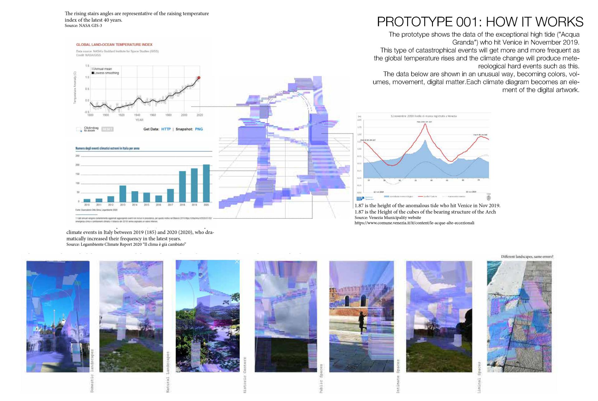 The project shows through an innovative and horizontal approach & new aesthetic the impact of climate change we live in our urban environments, to create a common awareness of the entity of the diagrams that climate reports shows. This project is an interdisciplinary tool which gives to people awareness about the importance of sustainability, climate change emergency, and the green deal data.By giving to the people the tools to SEE the hidden data of the environment they live in, there AWARENESS starts. And from awareness, comes the sense of belonging and so new LANDSCAPES OF CARE, on which buildind the cities of the future.