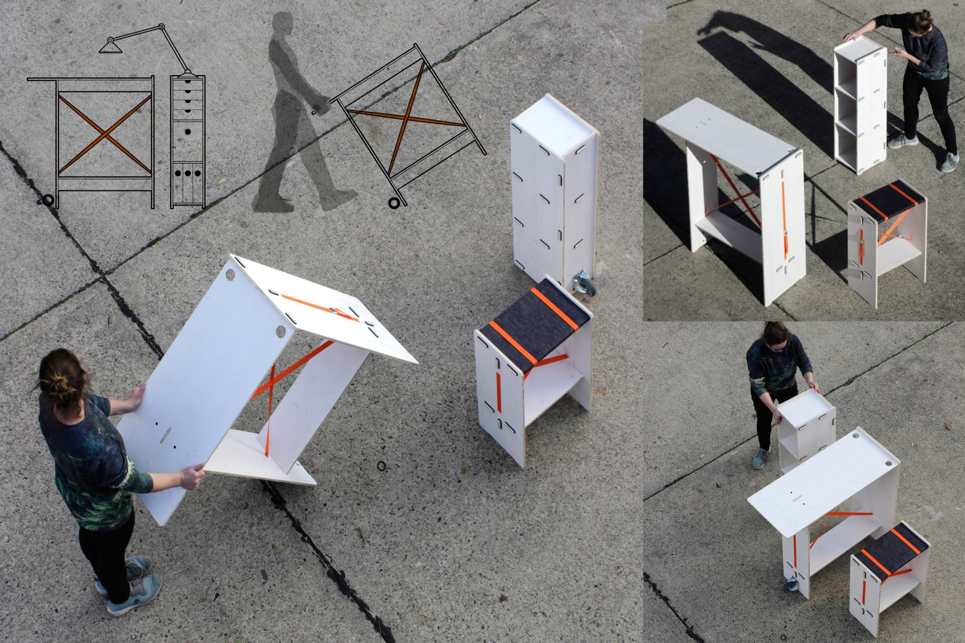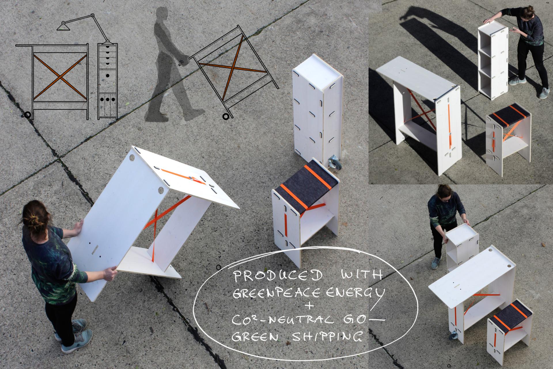 Adaptable: Since the objects are freely positionable, different room situations can be handled. In particular, smaller rooms can thus become a workplace. The product is based on a modular plug-in system that allows all the advantages of material separation and moving or transport. The shelving tower can be freely equipped with a wide variety of filing systems. Depending on the use, the filing system is expandable.