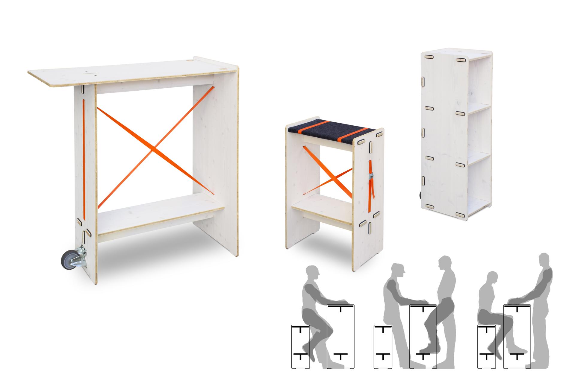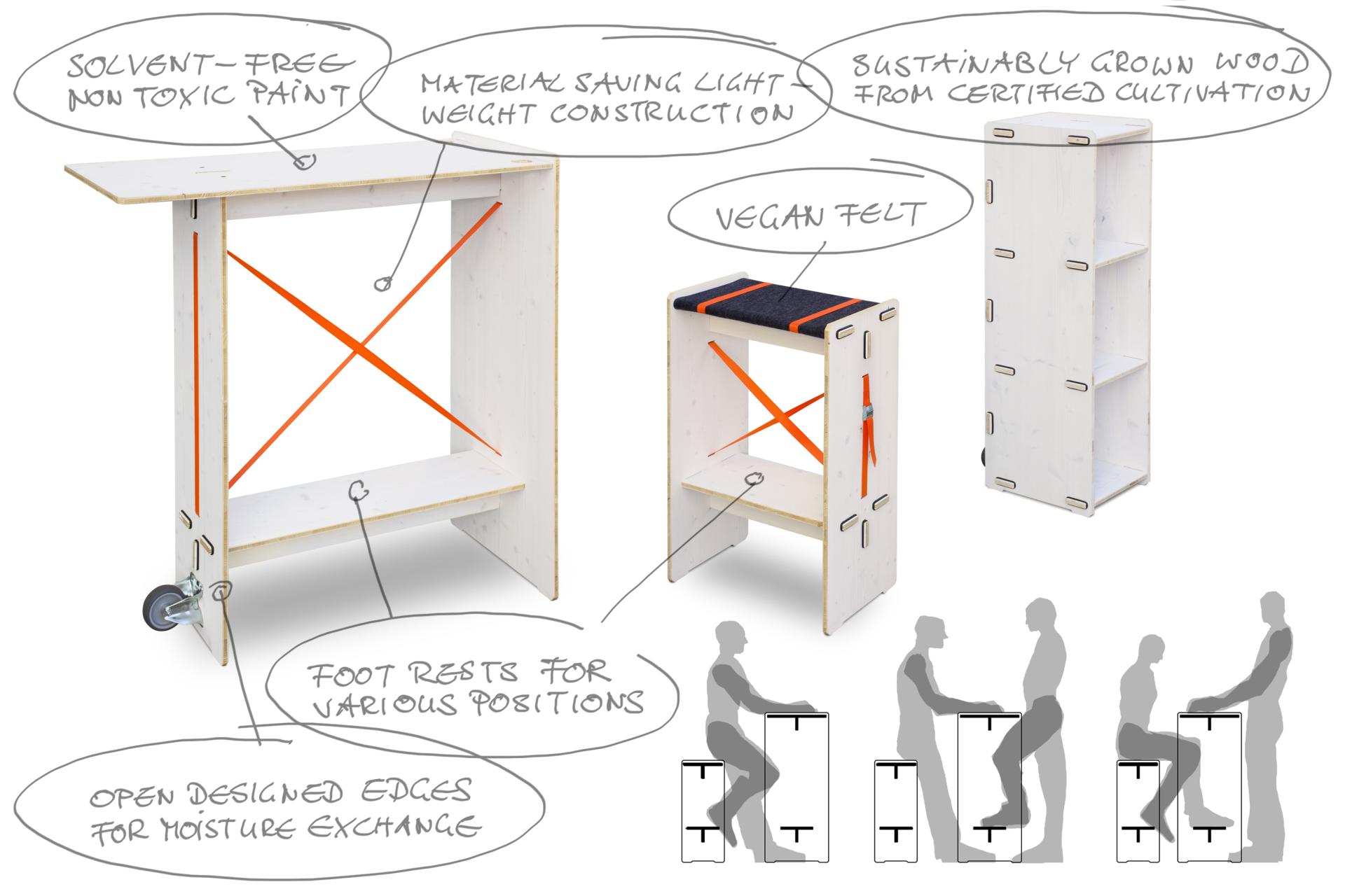 Sustainable standing workstation (table in 2 heights / Stool in 2 seat heights / Shelving tower) The product is based on non-toxic principles, regarding materials, surfaces, production and distribution.
