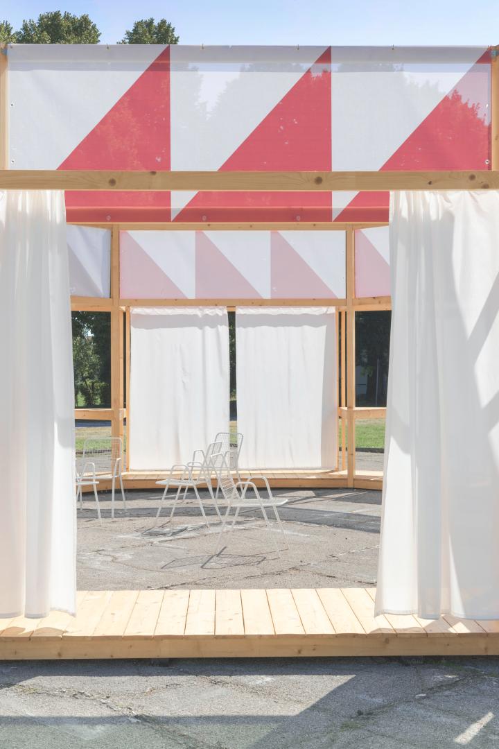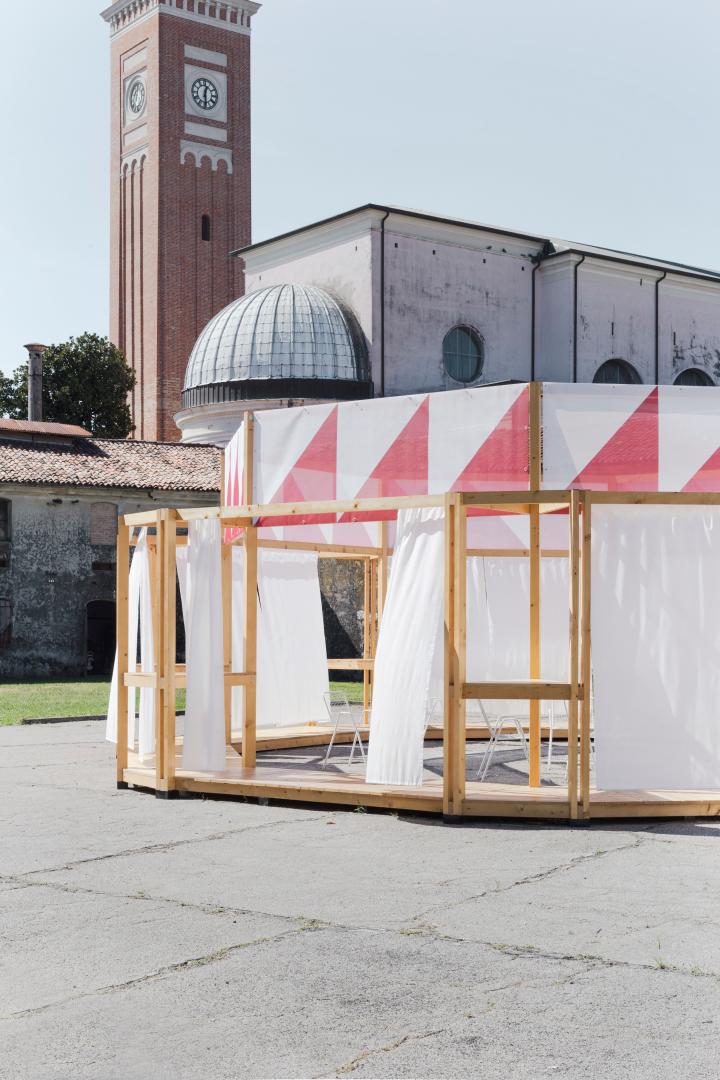 The conceptual core of the design was the central plan because of its ability to indicate a pivotal point - coherently with our suggestion that, at a bigger scale, it is how the barchessa could work for the village. The centrality was also able to materially foster the gathering of people in a defined and yet, in this case, not closed space. The "framework" aesthetic was expressly temporary: the fixed structure of the pavilion was a permeable framework to indicate a place, fluidly defined by flowing curtains. Accordingly to this designed centrality, the pavilion was placed at the center of the "aia" on the platform where the wheat was once used to be dried. This supports a specific phenomenology of the place, as once one entered the courtyard, one was invited to reach its center, a standpoint to perceive the built landscape in its entirety (this was also due to the fact that the buildings themselves are not accessible to the public, as they are in precarious conditions). The decoration - the patterned textile running around the top of the pavilion - works as one with the structure and declares once more and iconically the "feast" intentions of the project delivering a catchy image.