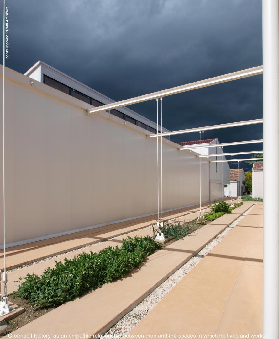 The new productive settlement was been redesigned with the intention of mending the dialectic and stringent relationship between man and nature. The intervention recognizes its ethical foundation in the conception of the natural space and its workplaces as factors underlying the ecological transition and the democratic education of civil society. Volume and surface were distrubuted according to a spatial articulation that intersperses the buildings with gardens, small courtyards and open-air galleries that relate to the surrounding landscape. The new volumes tend to reconstruct the marriage with the environment, contributing not only to the reorganization of spaces, but also to the sensory well-being of those who work there. The two twin buildings are articulated in the form of a ‘green factory’ that harmonizes the man’s action with the order of nature, seeking that dialogue between the settlement and the environment which in rural architecture took place with spontaneity and balance. The drains of the toilets are collected in special filter tanks cultivated with phyto-purifying plants, in turn fed with rainwater conveyed there from the roof of the buildings. The softness of a reconstructed nature returns in the simple alternation of native species that interact with seasonal crops, to describe a linear vegetable-garden that animates patios and paths. The arrangement of the green is of great importance. Nature will find its home in pylons and pergolas, compensating, at least in part, for the loss of a small portion of the countryside with the construction of an “artificial landscape” which resonates with the natural landscape. The sensitivity towards work spaces on a human scale (“villas” rather than “temples of work”) wants to be the foundation of a workshop of sustainable production in which the primary elements of Nature, like and perhaps even more that the artificial materials of construction, reconcile man with the semantics of work.