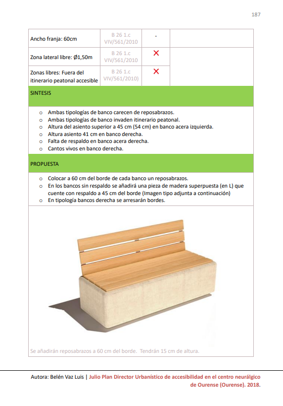 - A report that will enable clients to obtain the necessary information to assess the possibility of improving accessibility: analysis of the different streets, furniture, bus stops, ... Each set of elements in a file, with the image and the solution that was grouped by streets. The solutions had two degrees: the standard ones and those that needed a larger project, such as green spaces. These projects developed further. Finally, a functional and economic assessment of the actions, so that the city council could create priorities.