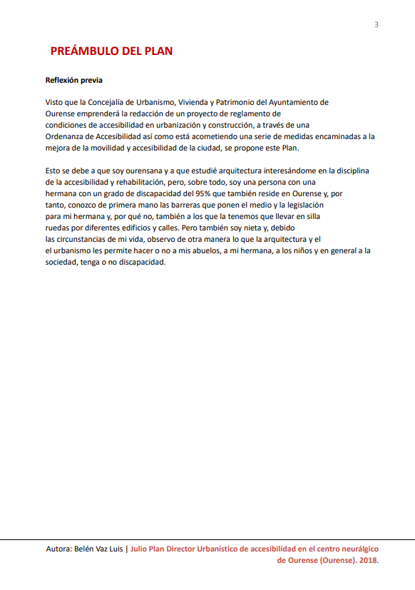 When I created this new planning technique, I had the participation of the Association of People with Disabilities of Galicia because, another of my objectives, was to transmit the idea that technicians, designers ... we need the opinion of the diversity of people to create products, designs, architectures ... for all people. This is something that I make clear at the beginning of the document of the "Urban neuroaccesibility plan". Nowadays, when I meet to make an accessibility plan for a city (then plan of Ourense has not yet gone ahead), it is something that I always make clear to the councilor: I want to count on the experience of the diversity of people that inhabit.
