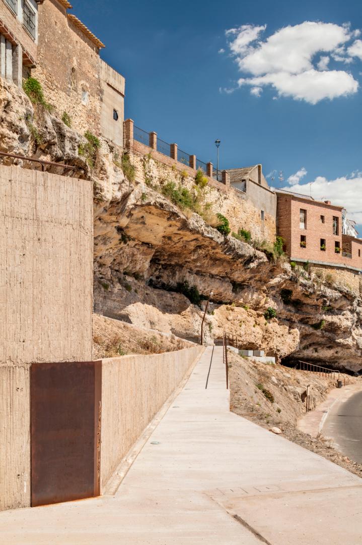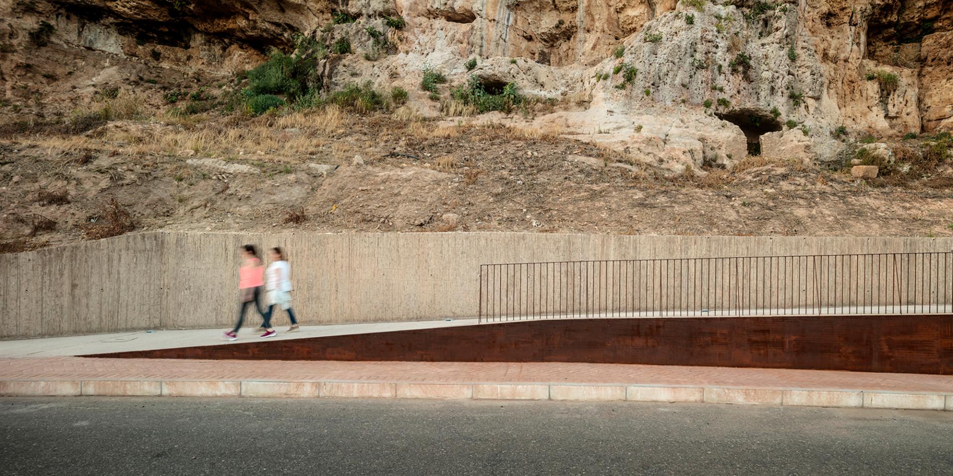 For the enhancement of Caño de Hierro a pedestrian promenade is proposed. This walkway starts at the access road of the town and culminates in the largest of the caves, la Cueva de las Carretas. The operation must span nine meters in height and the surface available to solve this ascension is limited. Six retaining walls are drawn as well as six cuts in the terrain, resulting in the pedestrian promenade: a geometric layout that solves the ascent and the transition from a road to a natural, rugged environment.