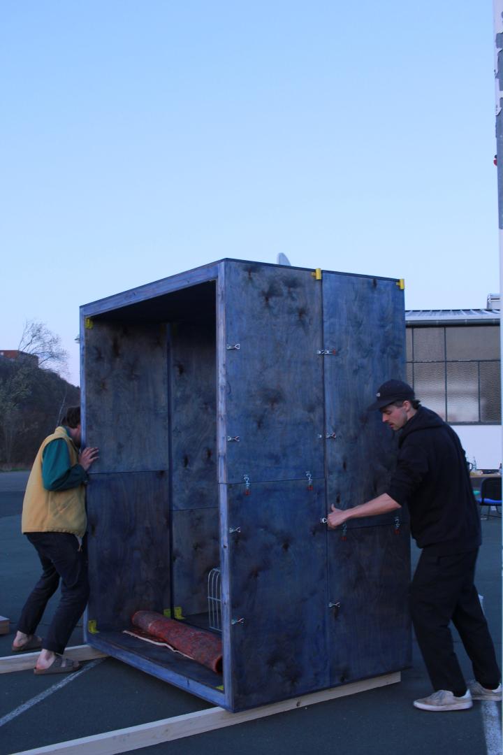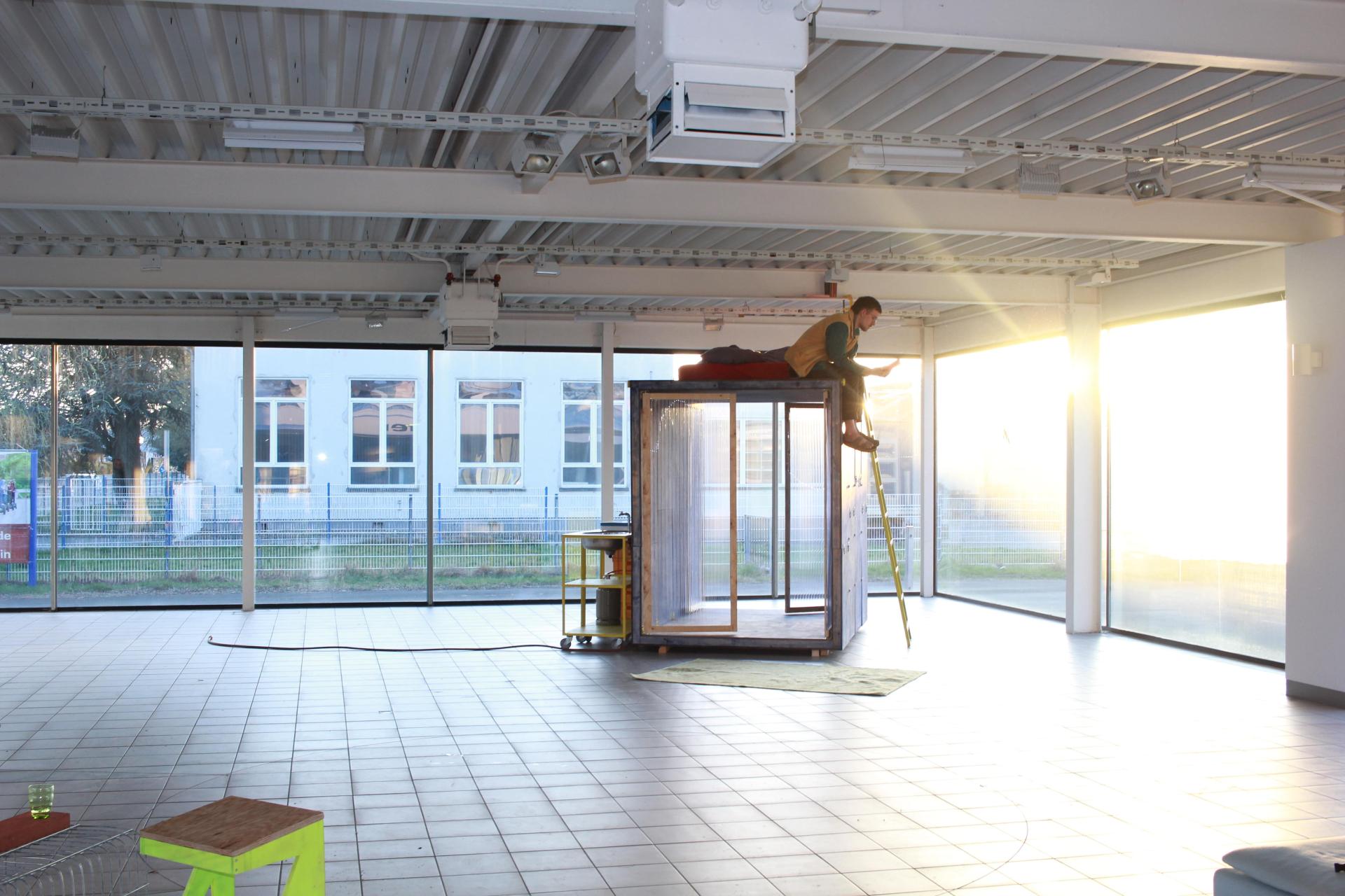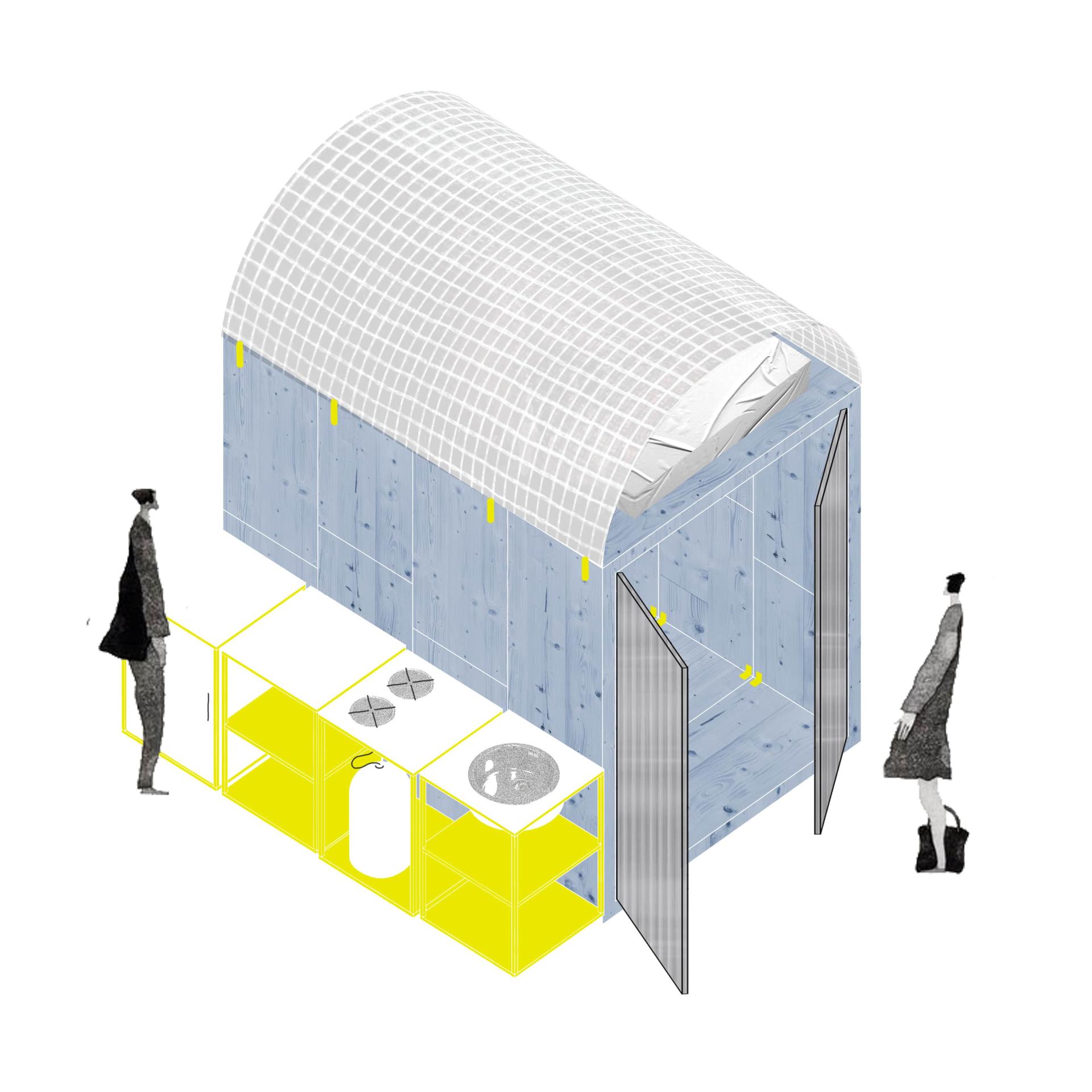 We have built a prototype and used it living in an abandoned car dealership. Prospectively multiple units can be combined to set up more complex structures. The basis tries to reduce fixtures to allow an experienced negotiation of needs. It is intended to be used as a kind of measuring station, therefore the design is kept plain.