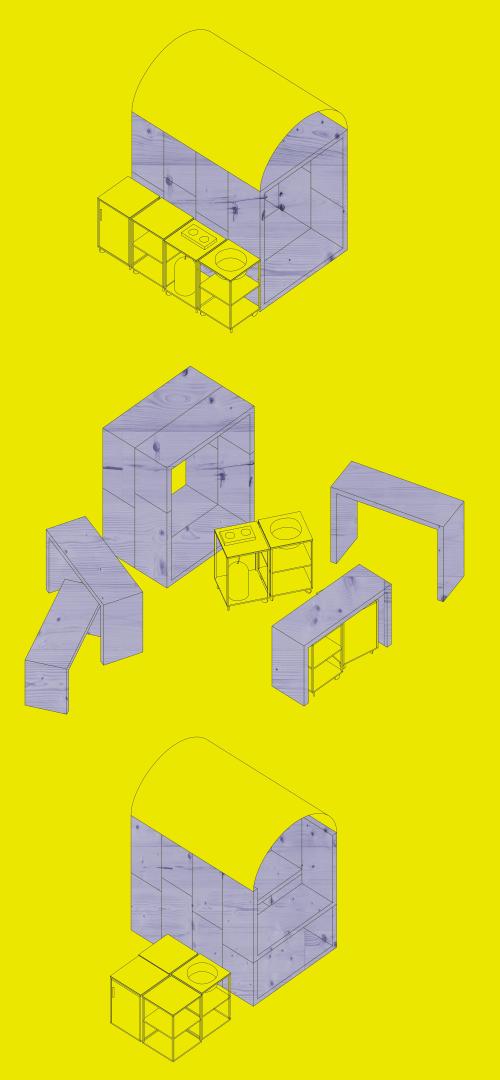The basis is a movable modular structure to occupy vacancies. It provides an initial infrastructure to work and live in. To make spaces viable in a fast and simple way, even for a short period of time, we designed the modules to be multifunctional. The structure can adapt from a closed room to an open display. It can be situated inside an existing structure as well as outside. The space is joined through multiple stacked table-like elements and makes up a closed off unit, setting up a microclimate. The dimensions are reduced to the necessary. It can fit two people sleeping and up to four people working at a desk. A kitchen composed of four mobile counters is added as well as a tent roof. According to demand the structure can be spread out through the varying occurence of vacant spaces. Each element works on its own, there are three different heights: a work desk, a standing desk and a stage. They are stackable and can be combined to make up a grandstand.