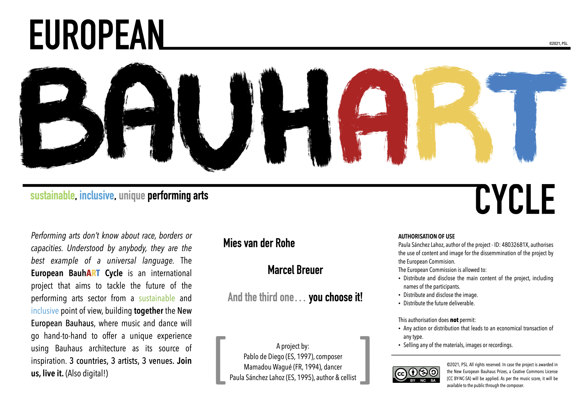 Performing arts don’t know about race, borders or capacities. Understood by anybody, they are the best example of a universal language. The European BauhART Cycle is an international project that aims to tackle the future of the performing arts sector from a sustainable and inclusive point of view, where music and dance will go hand-to-hand to offer a unique experience using Bauhaus architecture as its source of inspiration. 3 countries, 3 artists, 3 venues. Join us, live it. (Also digital!).
