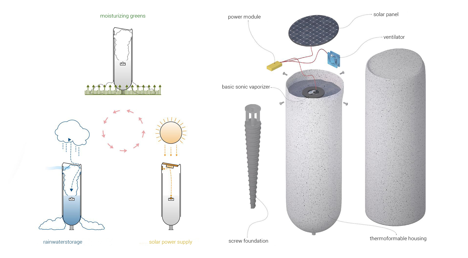 PARO is made of two overlapped shells put one on another. The object is placed in the ground through a compatible bolt foundation. With the help of a simple ultrasonic evaporator, the collected water is converted into mist, released and then evenly distributed. The cyclical activation of the device allows for regular moistening of lawns, creating a favorable biotope and an interesting visual phenomenon. Whole device is powered by a small photovoltaic panel.