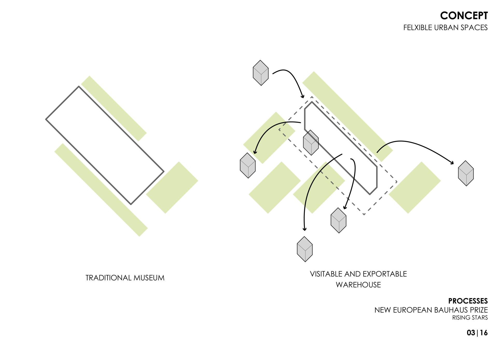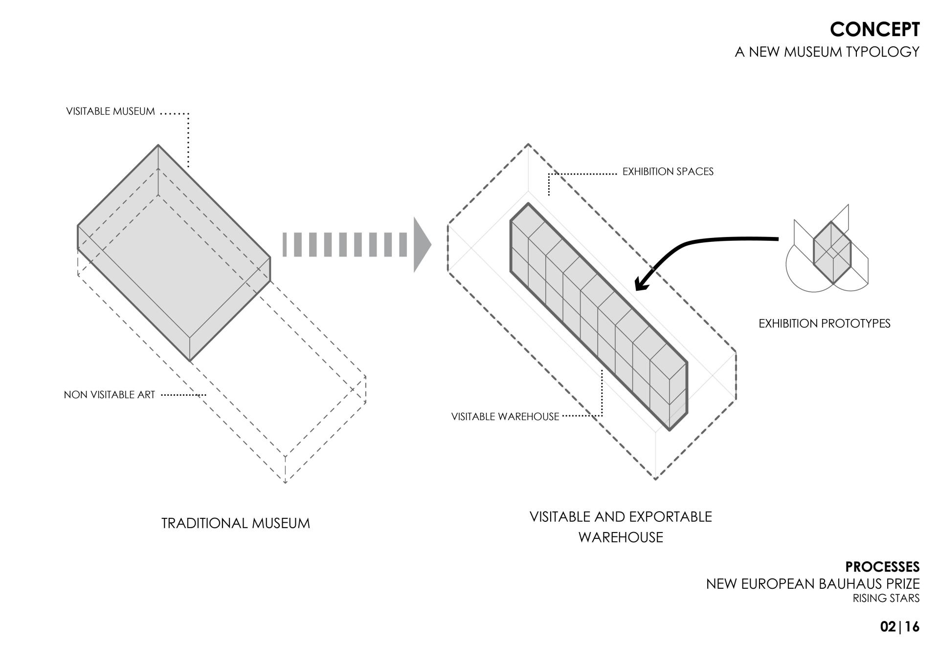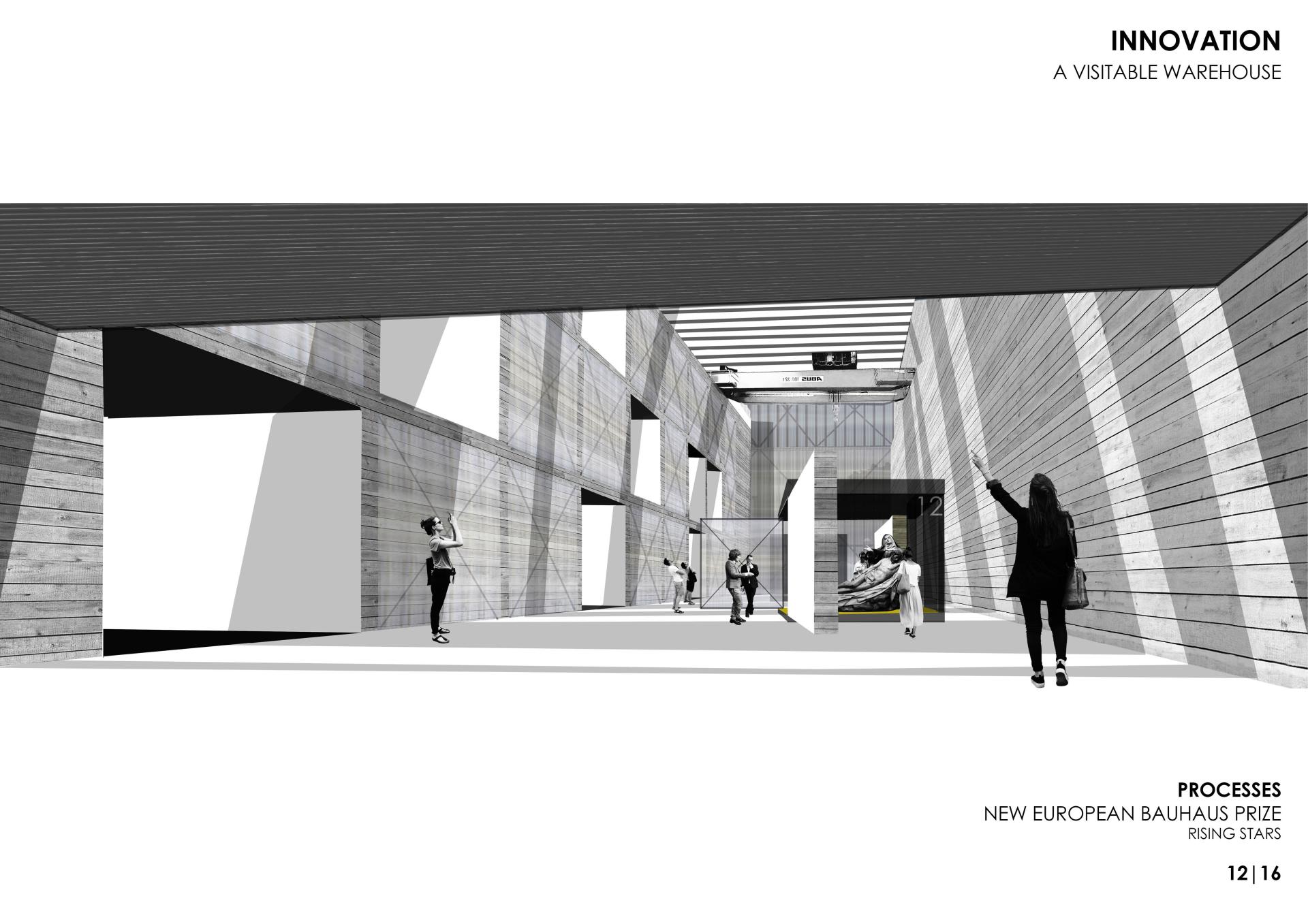 3. Democratize museums as open warehouses. Museums and art collections usually allow a very limited access to their works. The PROCESSES project tries to democratize access to museums by creating authentic open warehouses where exhibited pieces are selected and set up. Specialized researchers and visitors will be able to naturally access a large part of these collections. This would create a new unprecedented architectural typology as visitors and the conservation of the pieces are the main actors.