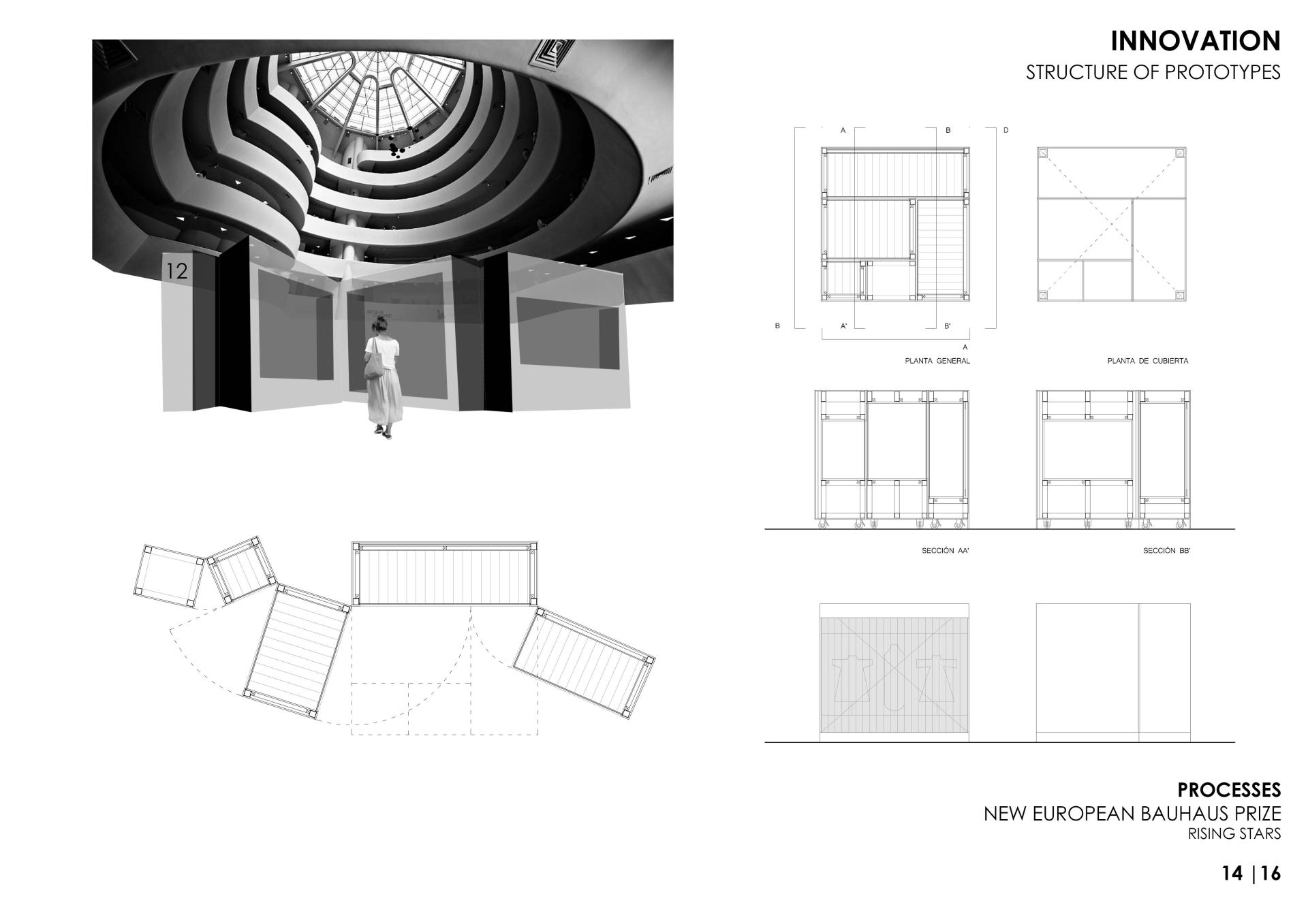 1. A new type of museum for the incoming decades. The main innovative aspect of the project is to conceive the museum in a completely new perspective. The museum is thought as a dynamic and changing place always in transformation. To get this idea, a storage system for art pieces is proposed shaped in exhibition prototypes that can be visited in their stocked position. At the same time, these pieces open up and display an infinity of exhibition possibilities. In this way they can be moved to larger exhibition areas within the museum for their contemplation, playing with different displays depending on the purpose of the museum.