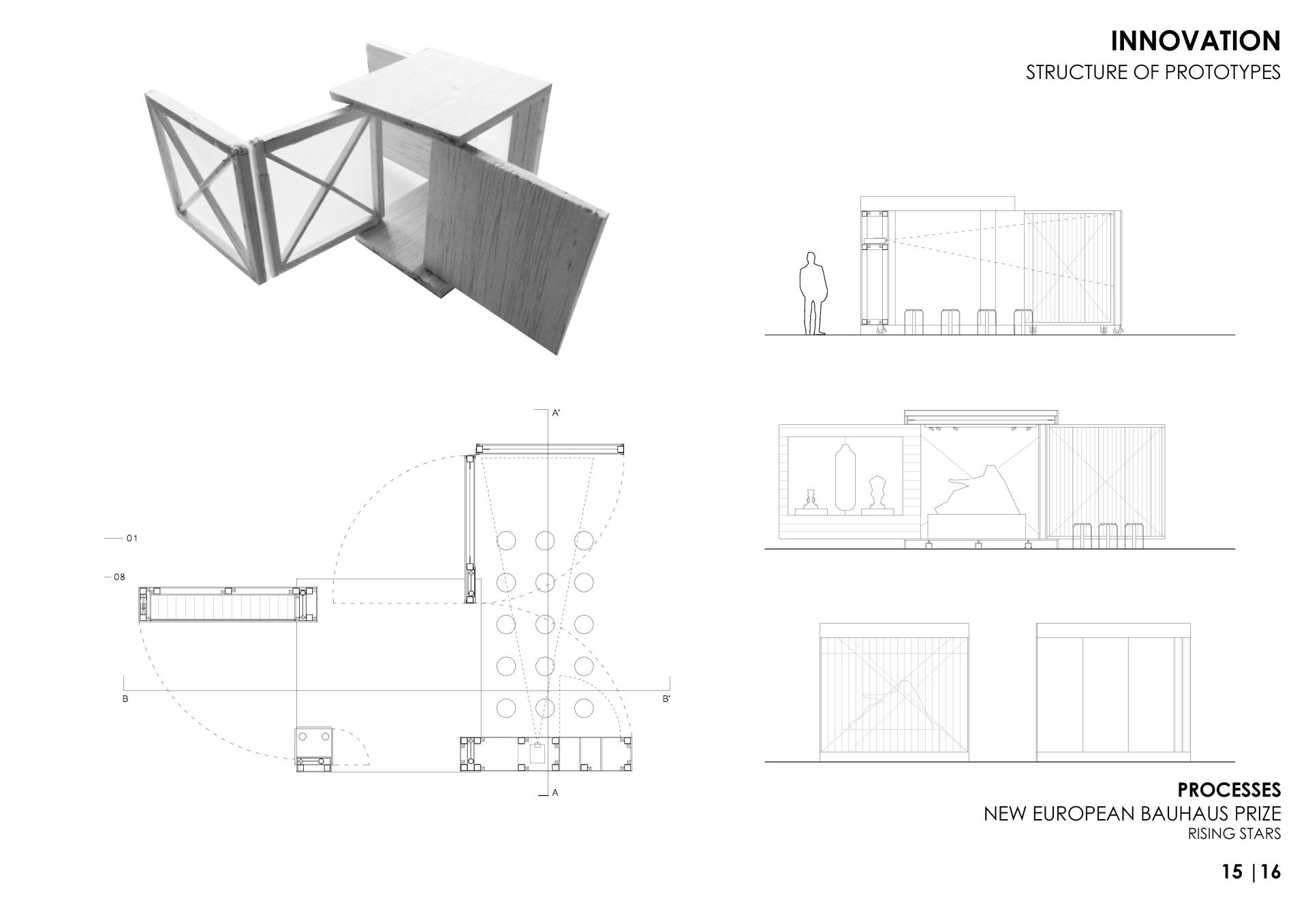 The PROCESSES project also represents a reflection on aestheticism as an architectural piece. The image follows the function for which the prototypes are conceived: the creation of visitable warehouses and easy exportation of art. The aesthetic aspects are defined by three main ideas: