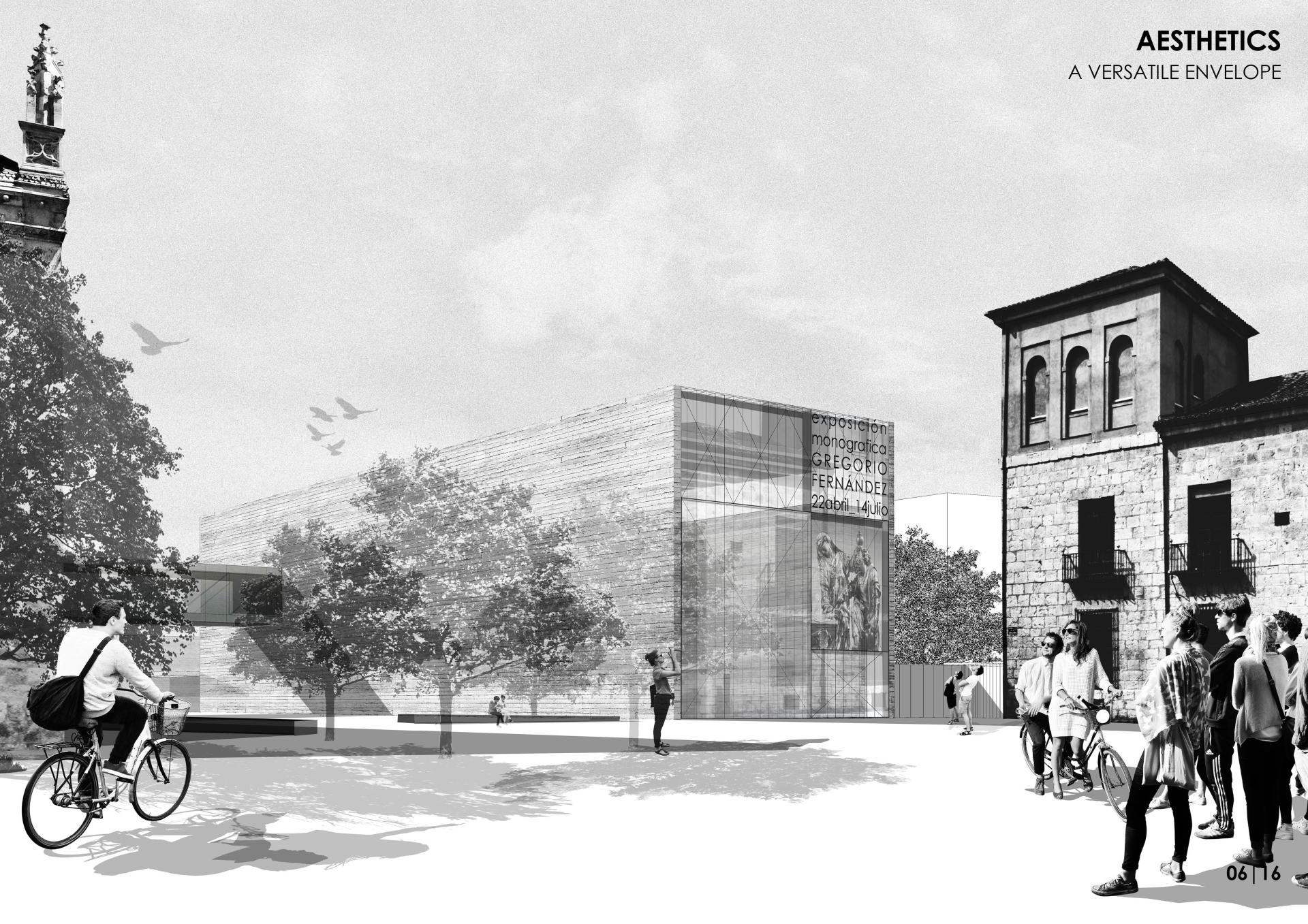 2. A versatile envelope. The idea of the PROCESSES project can be applied in a multitude of urban situations. It is a tool for creative uses in degraded urban spaces, colonizing them with art. These versatile warehouses create facade envelopes capable of adapting to different environments, blending in with the immediate context, using it for vegetation, energy creation or standing out as an icon when necessary. In the specific case study in Valladolid (Spain), the envelope is silent and is camouflaged with the textures of the historic city centre.