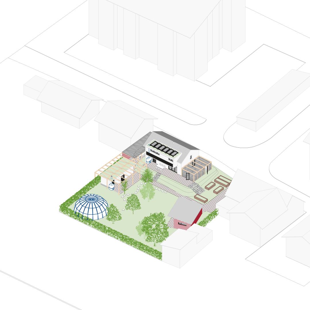 From the start onwards, categorisation of reclaimed materials and contingency planning will aim for at least 80 % of the material mass reuse on the property. It will represent experimentation with the micro-circular economy by merging the natural and reclaimed materials with an emerging ecological (regenerative) aesthetic. As a result, the cultural heritage can be persevered and upgraded. The skeletal construction of the ZW house serves as carbon storage and builds upon traditional building processes with modern construction and production methods. The biological flows will be carefully managed. The ecosystem will adapt to climate change through observation. In part by growing food and managing waste within the property, composting, and minimising household plastic use. The utilisation of available nutrients could, through permaculture management, result in a carbon sink and increase biodiversity. Solar and water use is identified for the ZW house and auxiliary buildings. Rainwater collection for household use and irrigation would enable a permaculture design, increasing both privacy and availability of nutrients for operational uses of the Garden. The solar passive aquaponic greenhouse will be integrated into the southern wall of the ZW house. There are no similar examples yet in the wider area. Various iterations of urban living will be explored. The auxiliary buildings, used as temporary habitation units (the Dome and Amenity Shed), can be used for activities of the local community organisation, enabling mobilisation of arts, science, and ecology projects resulting in greater solidarity and education models. A commons-based approach in relation to the urban property will include the community through the Garden and the Tool Library. Locals can utilise the existing communal Garden and reimagine the boundary between private property and commons to meet and share. The project aims towards transferability and replicability for similar, future urban interventions.