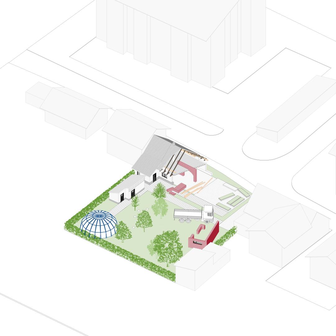 Another objective is to include the local population through reimagined private land use by establishing an urban-commons, through the already existing communal Garden and a shed transformed into a library for tools. The property already serves as a place for workshops organised by the local association, Zero Waste Žalec. Tool sharing practices are in use while next to the Old House is a Garden tended by elderly neighbours. These features are worth preserving and enhancing, without intruding on the privacy of the occupants. A new social commons dimension will be added by introducing a Tool Library. The primary material for the Tool Shed construction (bricks and wood) will be sourced from the Old House. The construction process will allow for the inclusion of the local community through workshops of a circular design approach. The Tool Shed single drip roof, and Amenity Shed flat roof are ideal places for green roofs. Alongside the main water collection system of the ZW House, a secondary swale water collection system will be installed on the Tool’s Shed to store rainwater and irrigate blooming perennials and nearby fruit trees. Alongside its main function as a storage area for personal tools, the Tool Shed will assume a community orientated function of a Tool Library. A commons-based dimension of space is added in this context, allowing neighbours and other citizens to borrow tools. The design, green roof and water retention features of the building itself could be copied and applied to garage units of the same shape, common in the town of Žalec. The temporary habitation unit, the Dome, can afterwards be used to host workshops, guests or lectures, thus enhancing the already existing activities on the property. The ZW House project is a living experiment whereby certain parts of private property become a commons managed area, providing neighbours from nearby apartment blocks with means of production and providing a place for recreation, gardening and socialising.