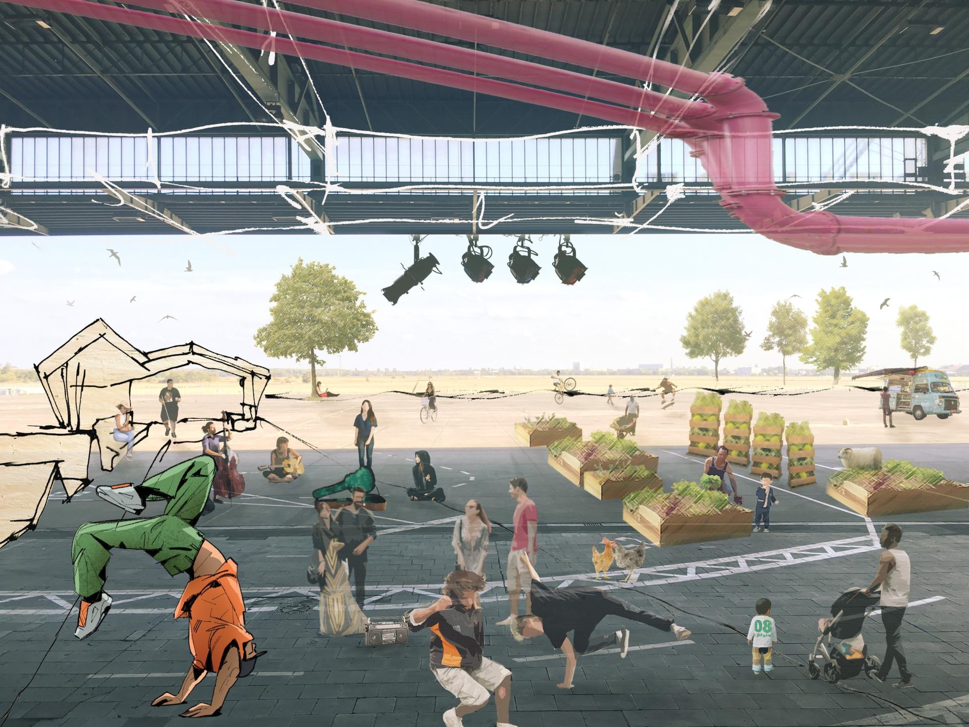 Berlin is known for its vibrant and unorthodox art and culture scene. The Tempelhofer Feld, an abandoned airport field is now a colorful public space where windsurfers, dancers, dog walkers, community gardeners and many other figures share a space.A transformation center for everyone does not arise on the drawing board or on the green field, it arises on what is already there: fallow land, empty and forgotten industrial halls and ruins of a dead and deadly fossil infrastructure.