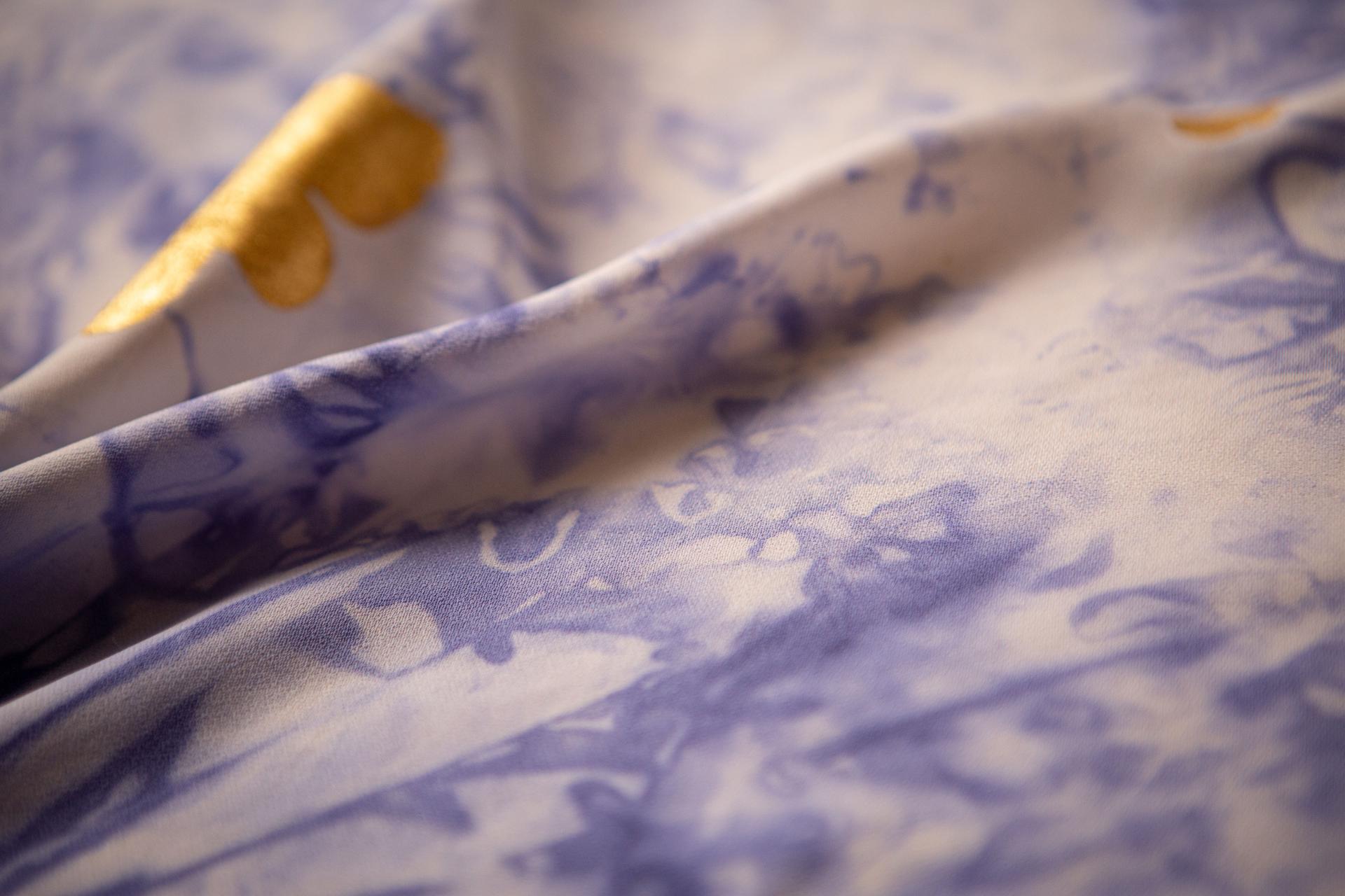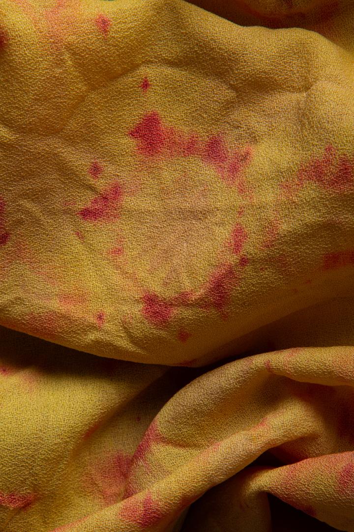 We created a new aesthetics of sustainability for costume design: textiles dyed with the radiant purple-blue from the bacteria Janthinobacterium lividum, red textures grown on textiles by mycelium of Ganoderma lucidum, and the shimmering beauty of cellulose nano structures creating structural colours made 100% of wood. Dyes made from bacteria or mycelium offer natural solutions to create colours which can be grown directly on textiles without any harmful chemicals or mordants, needing only sugars to feed the growing and colour producing organisms. Structural colours are light reflecting nanostructures that, in contrast to conventional pigments, generate rainbow-like colours without the need for chemicals or substitutes.