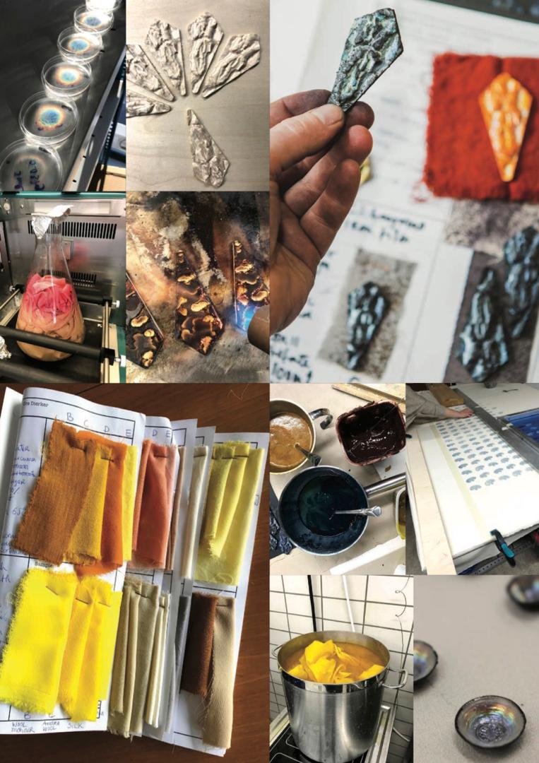The initial experiments were wide-ranging, and included ideas about cellulose-based 3D printable bio-ink, and soft and flexible cellulose-based bio-plastics. Both materials showed great potential and will be further developed for future projects. We focused on bio-colours using three methods that showed promising results. The bacteria Janthinobacterium lividum grew lasting purple-blue colours; the fungi Ganoderma lucidum coloured protein-based fibres in red tones; and cellulose materials formed beautiful structural colours on different wooden shapes.