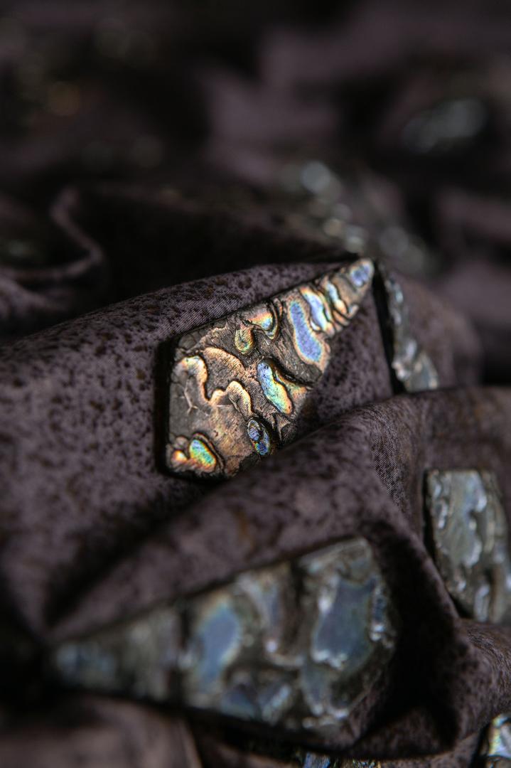 The aesthetic of the textiles shown in Naturally Dramatic were driven by finding design processes using advanced biomaterials for sci-fi inspired storytelling. Dierker had just worked on a television project creating costumes for different aliens and thought that the shimmering wood material would be particularly suitable for creating otherworldly looking textile designs.