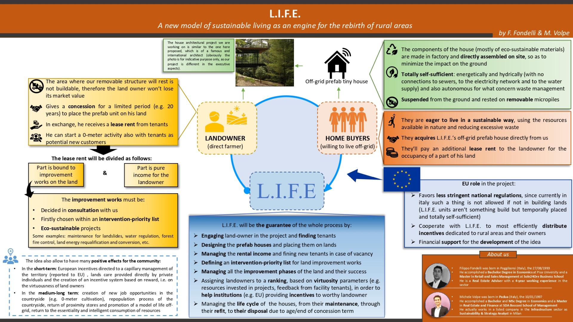 Generate a virtuous circle that brings wealth back to rural areas through the production of income from the implementation - not permanent - of prefabricated housing units with zero environmental impact and totally self-sufficient (with their income and management) on semi-abandoned land owned by private individuals, with the consequent re-use of a percentage of that income by allocating it to activities of value made on the land itself.