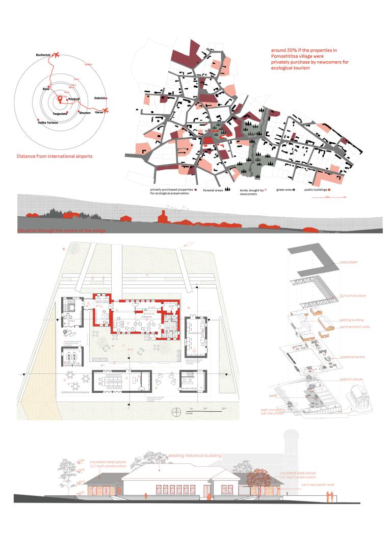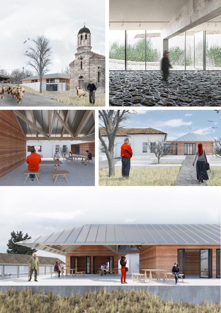The design project proposes to turn the center of Pomoshtitsa village into a meeting point for cultural exchange, where locals can share their knowledge and tourist can be entertained and immerse in the local culture.