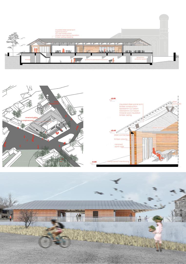 From all the solutions in the concept, the most detailed design proposal is for Community Center. It demonstrates the re-use of emblematic for the village public buildings and in addition to it- the use of materials like earth and timber, which are common and traditional for the region.