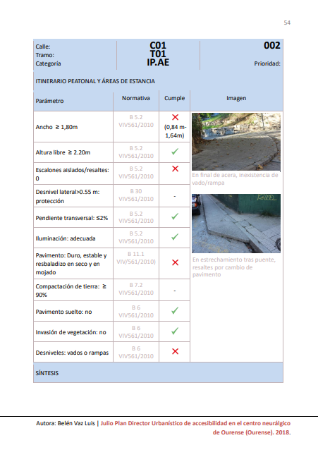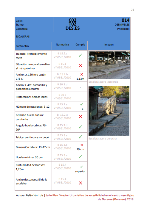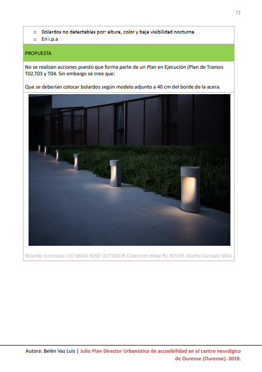 - A report that will enable clients to obtain the necessary information to assess the possibility of improving accessibility: analysis of the different streets, furniture, bus stops, ... Each set of elements in a file, with the image and the solution that was grouped by streets. The solutions had two degrees: the standard ones and those that needed a larger project, such as green spaces or a big regeneration area. Finally, a functional and economic assessment of the actions, so that the city council could create priorities.