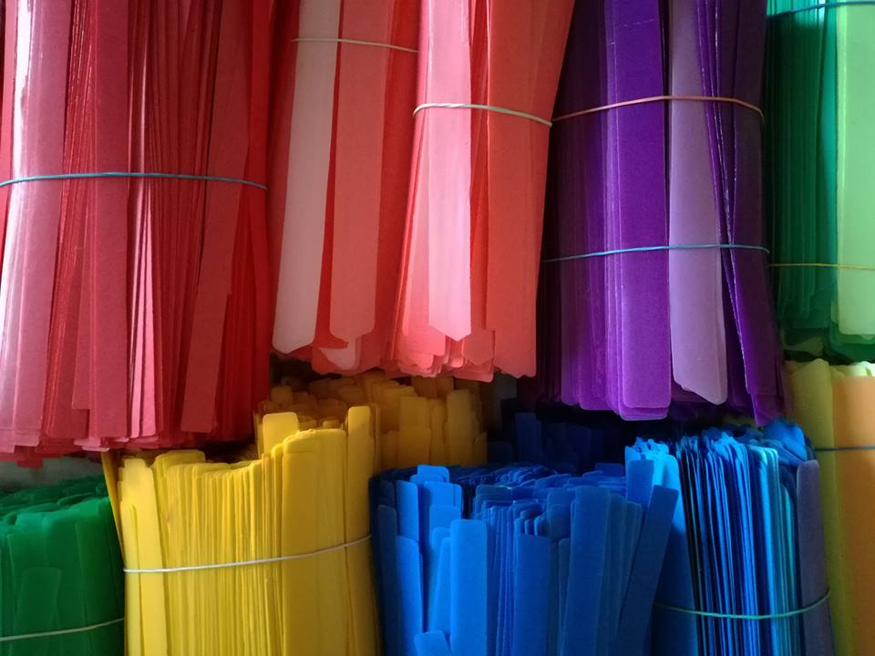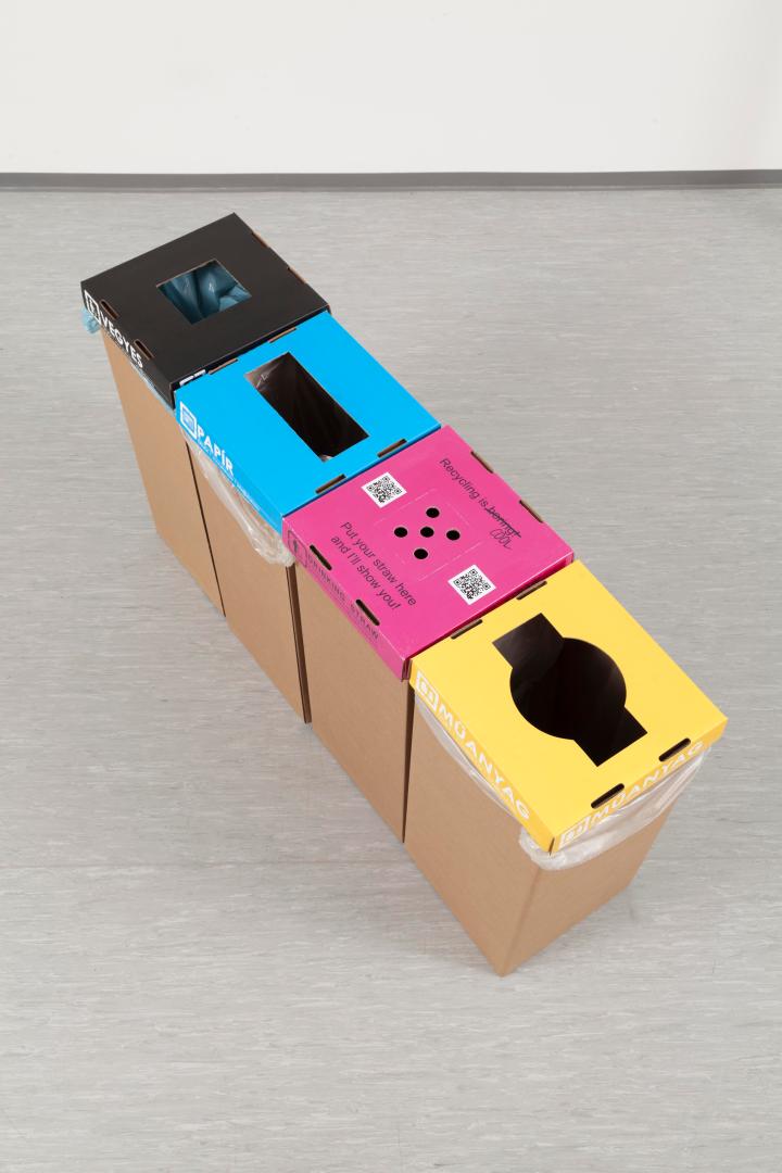 are discarded. When full the box is removed, with the straws being washed and organized by color. After being heat processed, everything is possible while using the resulting colorful strips of flat plastic to design objects or materials from them.