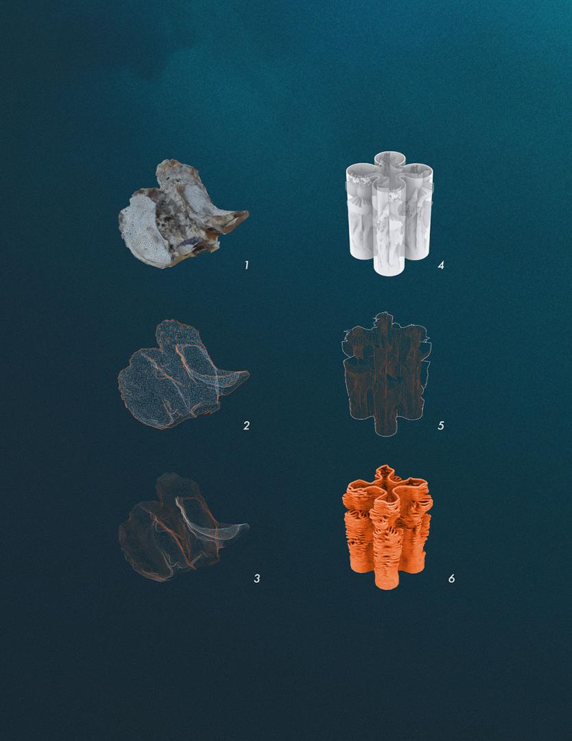 The “Below” aspect of the project will not be physically accessible to the public, but will be documented and exhibited digitally. Here we design 3D-printed clay habitat modules by engaging parametric design tools and expanding the scope of clay 3D-printing. Design principles for the modules centre around creating complex and varied forms which protect young ME while maximising surface areas and reducing areas for sediment collection. The resulting modules are sculptural works of art; one is based on cocooned lattice structures which mimic coral and the other generates complex surface textures using photogrammetry of pacific oyster shells.