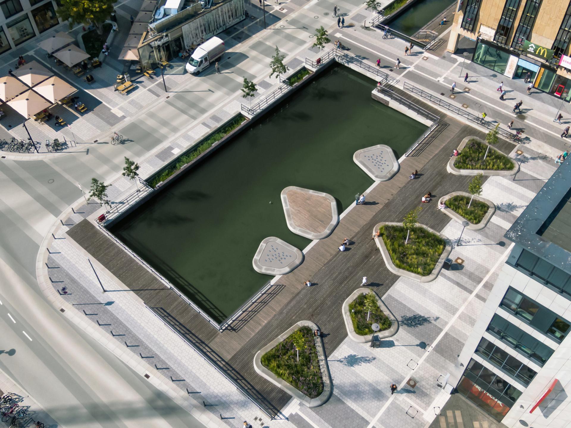 Also people wanted more green elements, less straight edges and more organic forms. Lighting was also wished for. Better quality cafés and restaurants were another demand. The design was influenced by all this as far as possible and changed accordingly. Meanwhile public approval is strong.