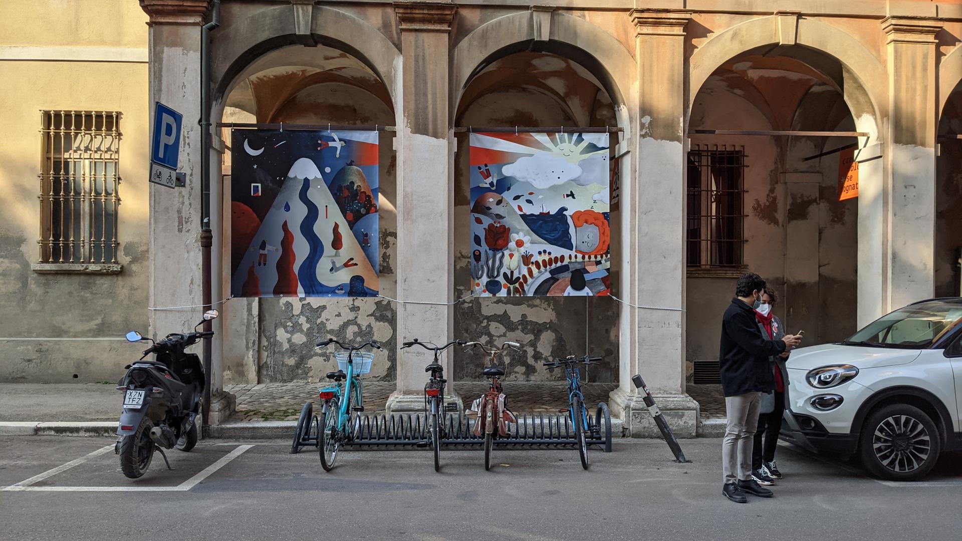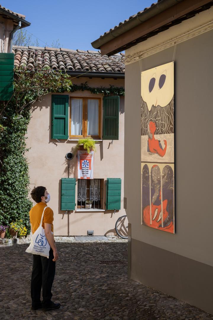The project worked in two directions. The first concerned the creation of visual and graphic installations related to the theme of the door and the threshold. Since the project started in the midst of the pandemic, our desire was to transform into images the sense of community that characterizes this area, that allowed residents to feel less alone during moments of confinement. We thus involved 10 young Italian illustrators who interpreted and gave visual identity to dialect texts by Cesena poets. The art installations were placed in the street in March, where they will remain until June.