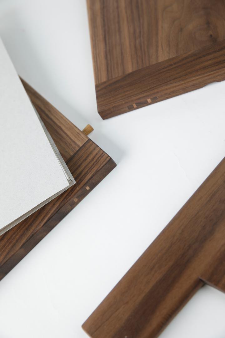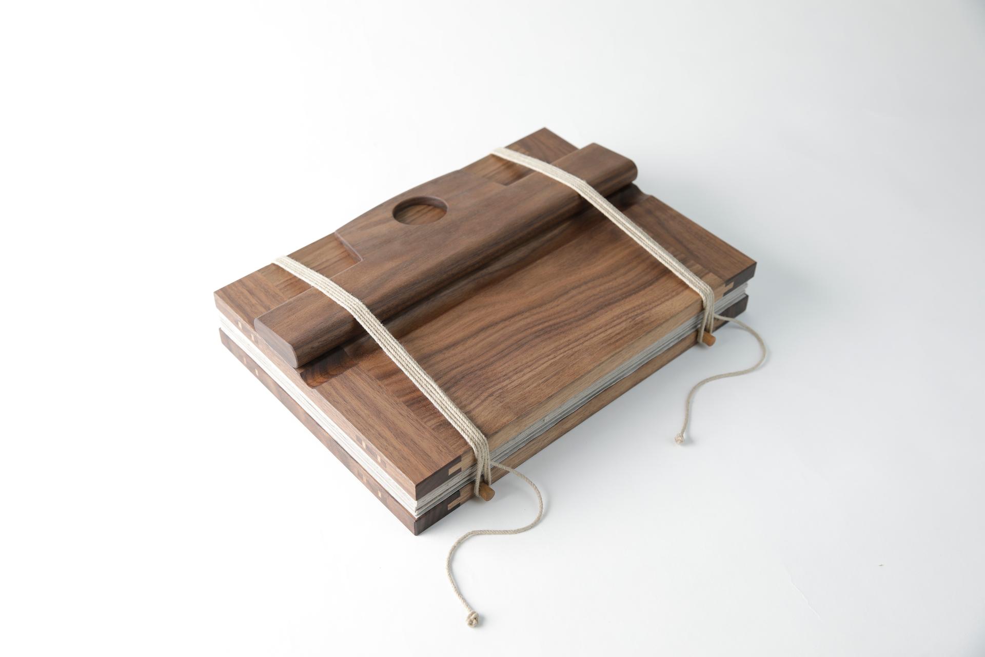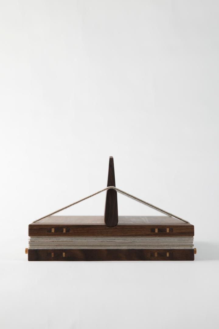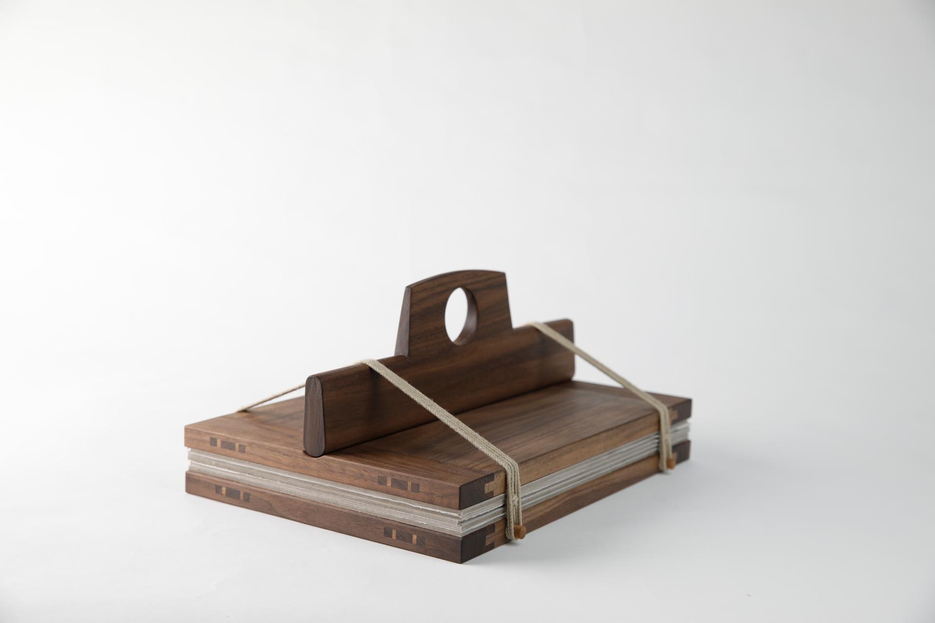 The first challenge of this design has been to find a pressing mechanism that does not involve materials that are not typical of traditional joinery, that is, to avoid, for example, the use of metal fittings or screws. In this case, with only two natural materials - wood and rope - the challenge of the mechanism has been solved. Let us also remember that the use of the rope is an own resource of the traditional cabinetmaking used in certain cases to exert pressure. The combination of the different woods chosen - walnut, cherry, and ash - is an aesthetic decision that helps me to accentuate the constructive and functional details. This product is made with manual/traditional cabinetmaking tools. It is 100% compostable and with a minimal production environmental impact and is easy to use.
