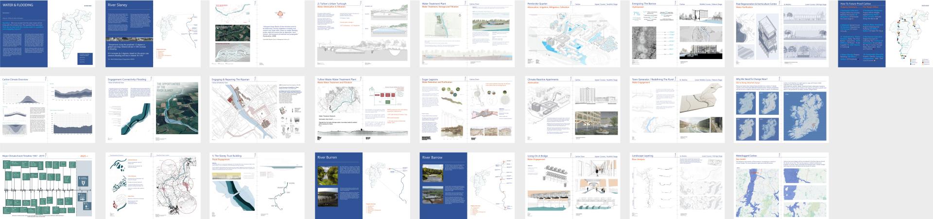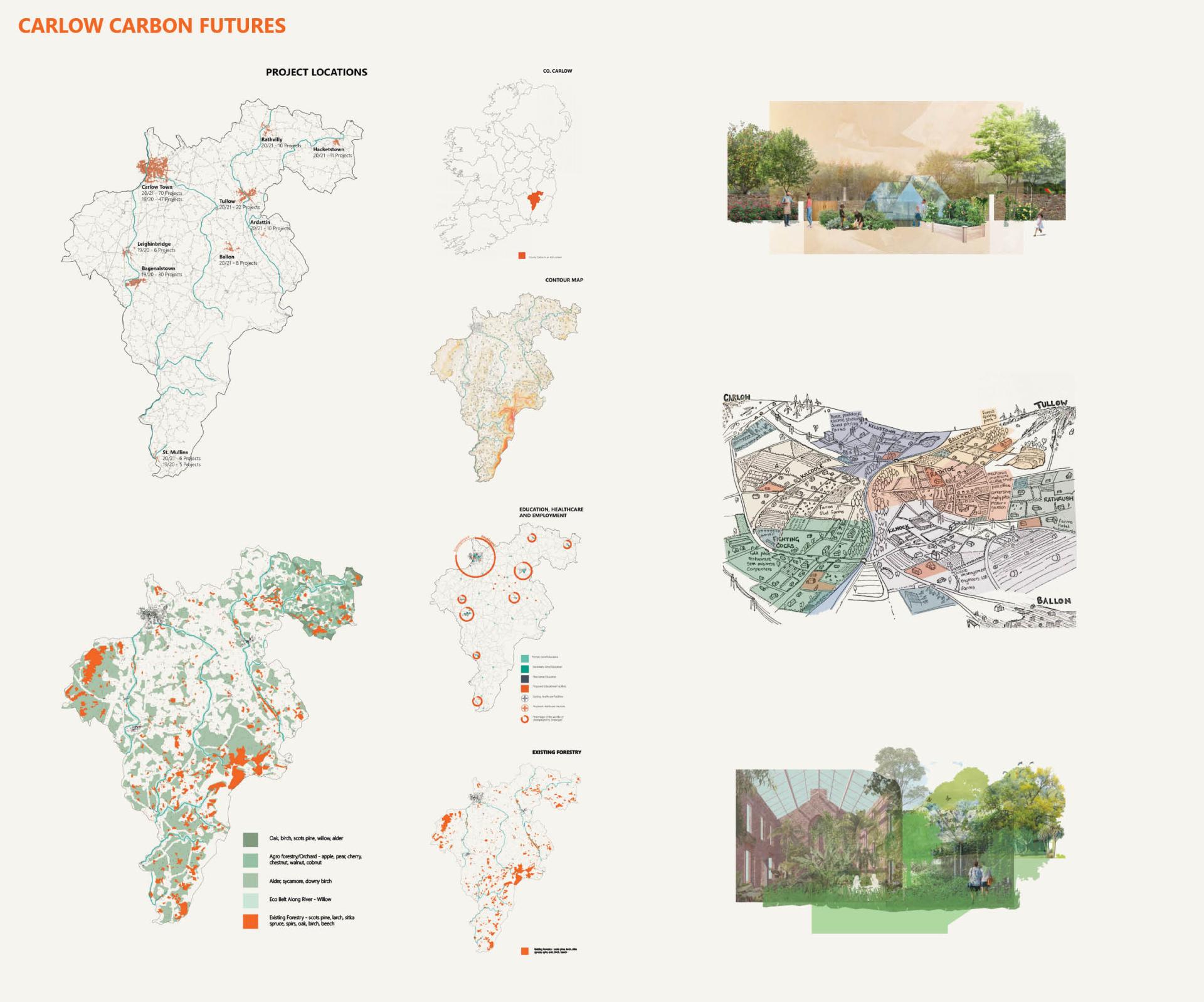 ‘Carlow Carbon Futures’ is the culmination of an expansive two-year speculative research project undertaken by an architectural design collective of 130 TUDublin students and academics producing 400 projects to radically remodel both the built and natural environments of County Carlow, a landlocked 897 km² region of central Ireland. Carlow’s population is circa 57,000 people. Our pioneering concept is to transform and re-develop the region which is currently in decline and regenerate it through a series of innovative positive community-based projects, streaked with radical thought, creative solutions, and regenerative experimentation founded on principles of sustainability and a philosophy of climate-literate design which permeates each intervention.